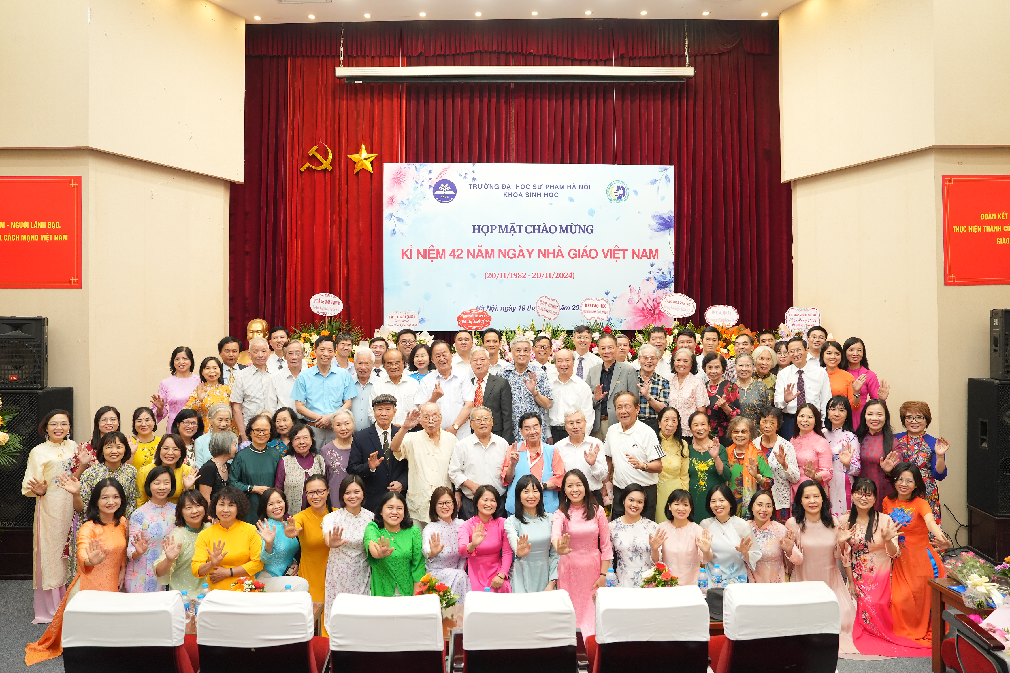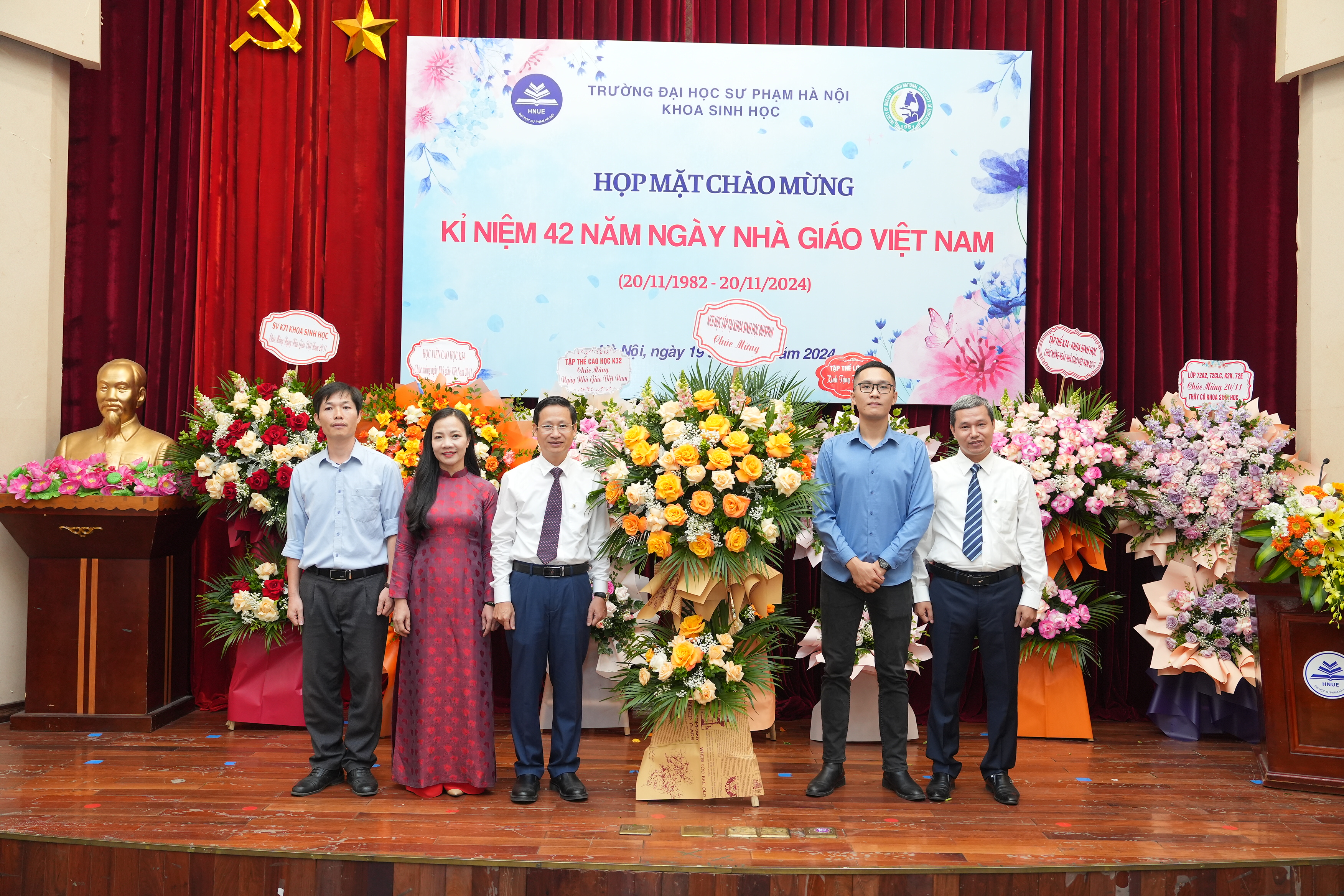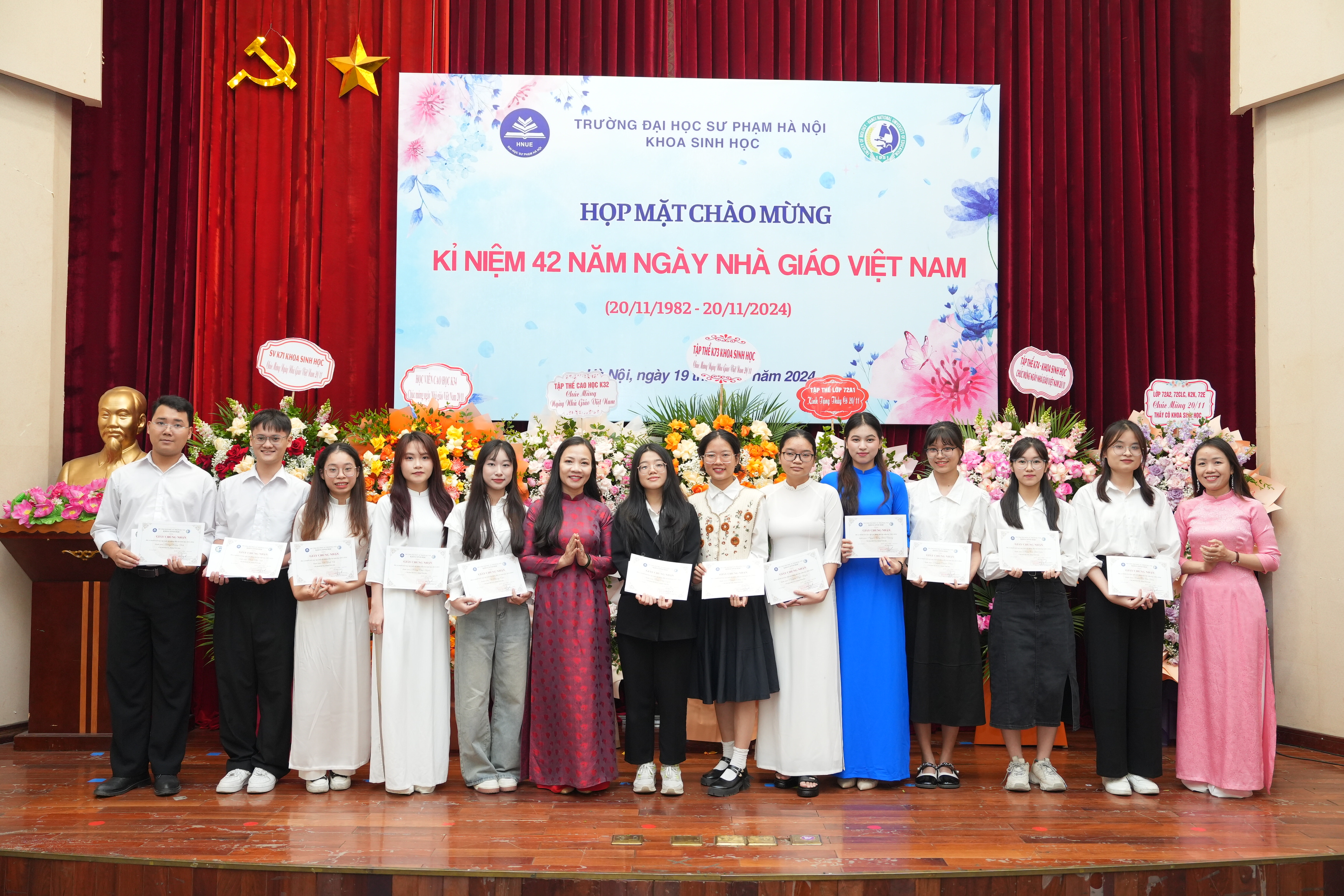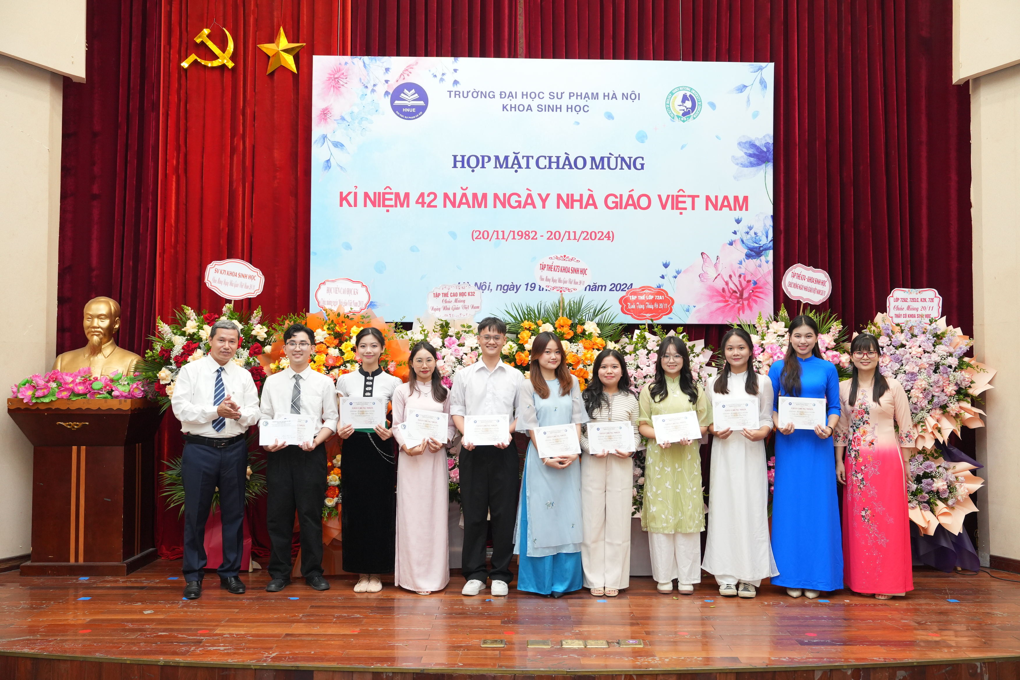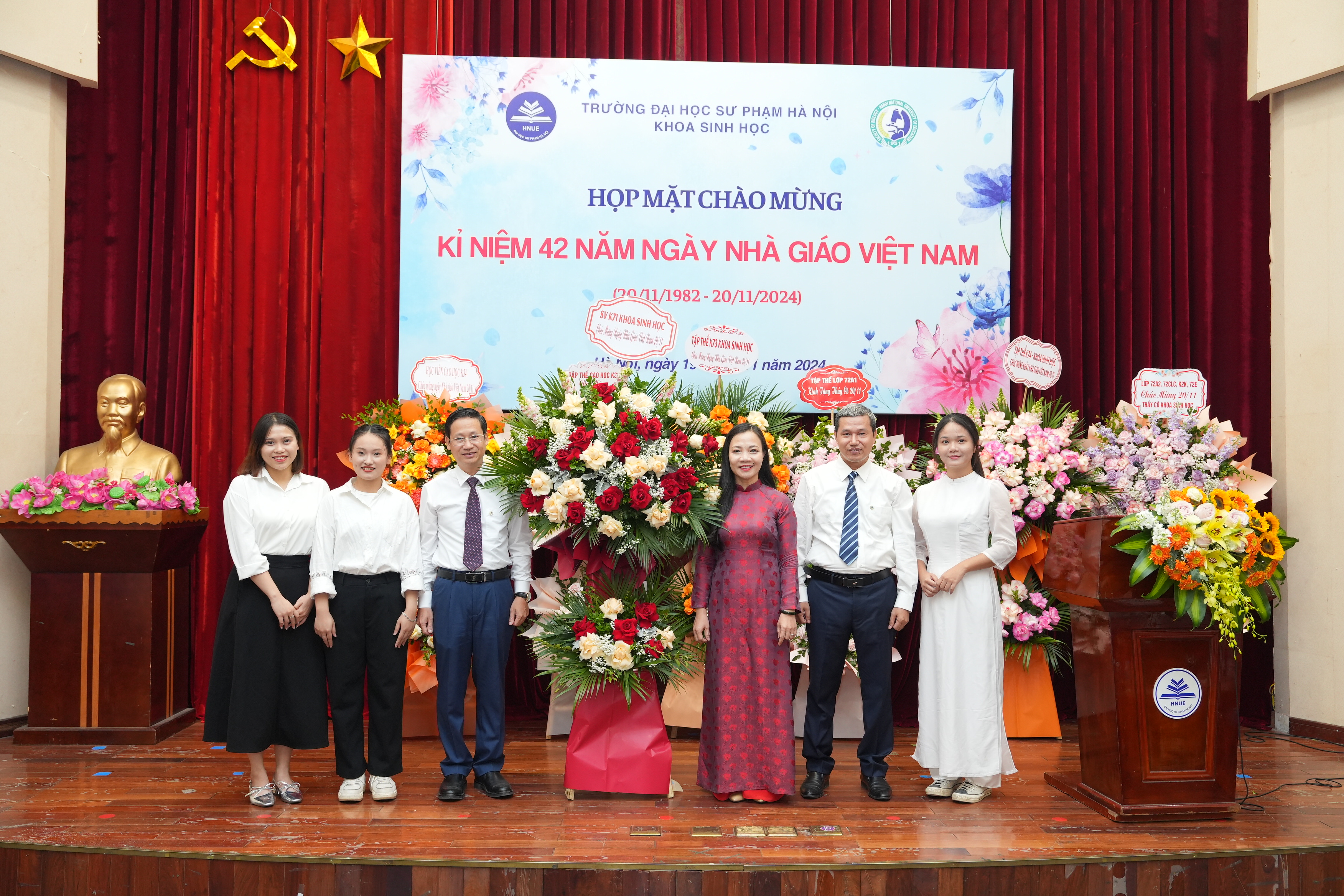 Đại diện sinh viên, cao học và nghiên cứu sinh tặng hoa chúc mừng và bày tỏ lòng biết ơn sâu sắc tới các thế hệ thầy cô, các em rất tự hào vì đã được học và trưởng thành tại ngôi nhà Khoa Sinh học, trường Đại học Sư phạm Hà Nội.