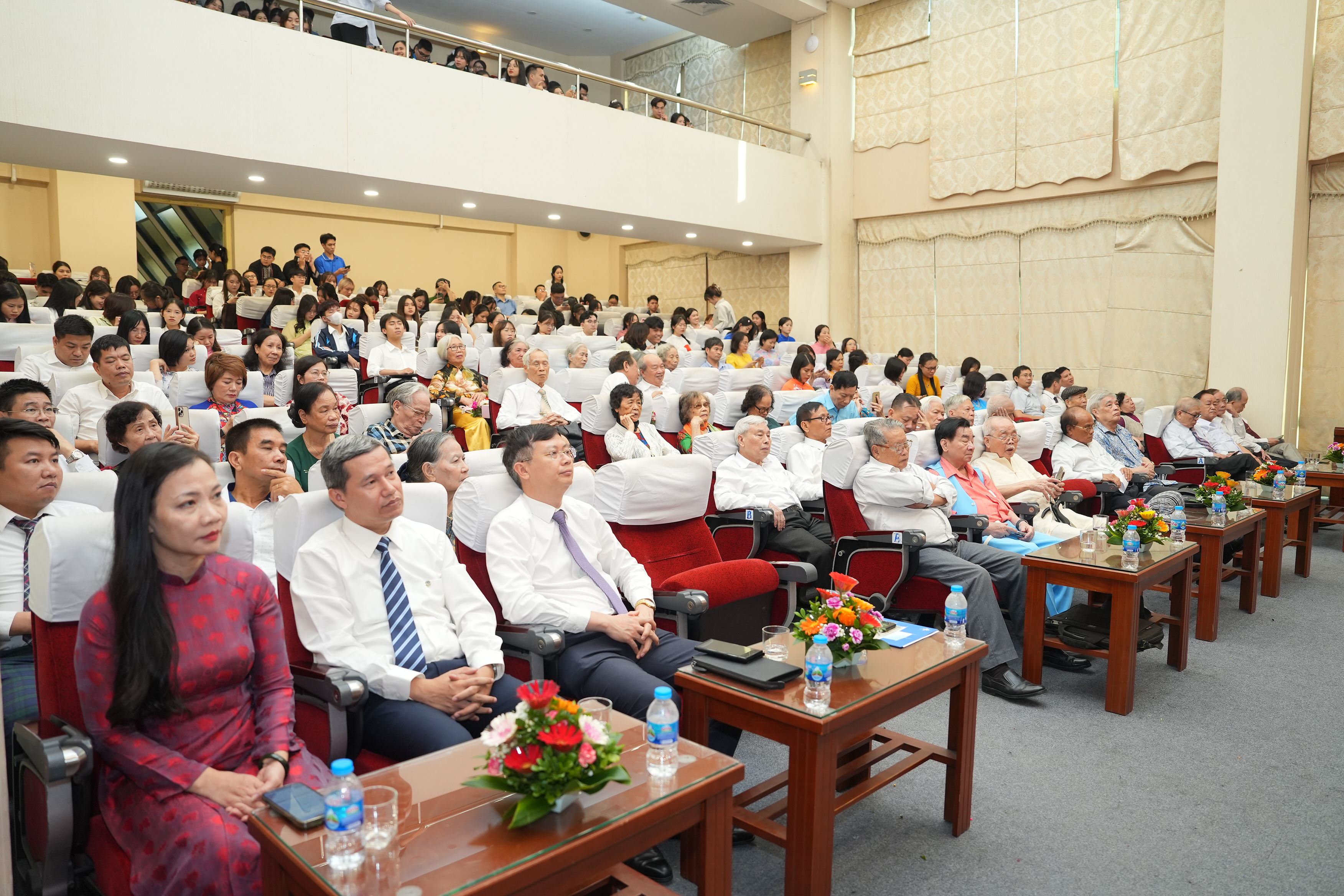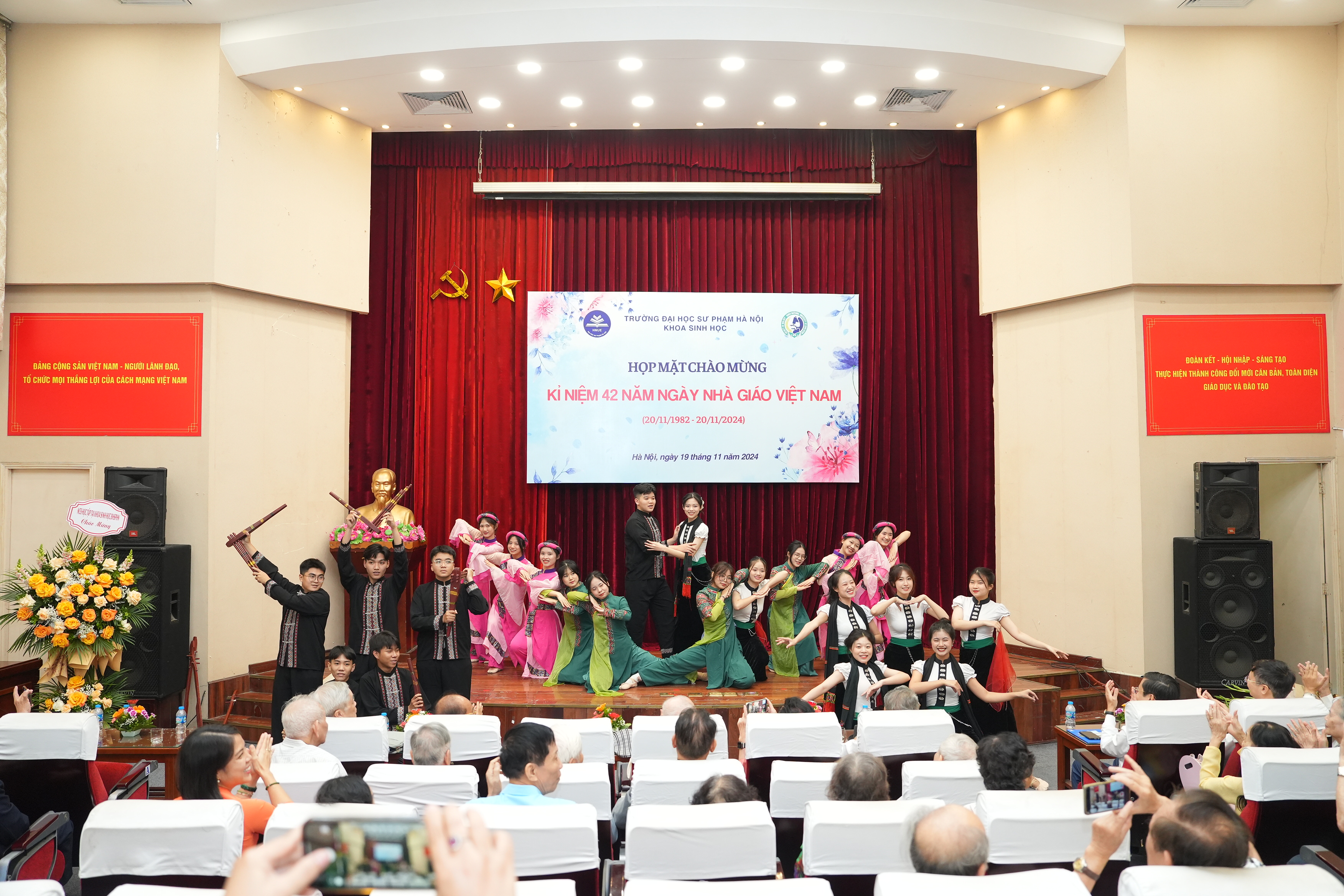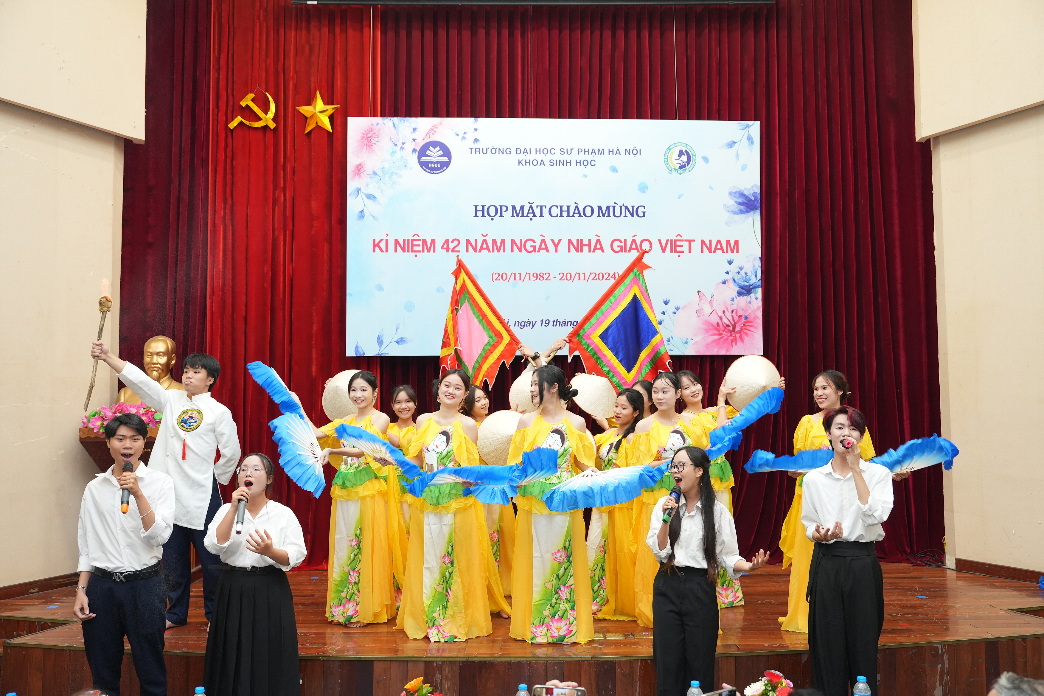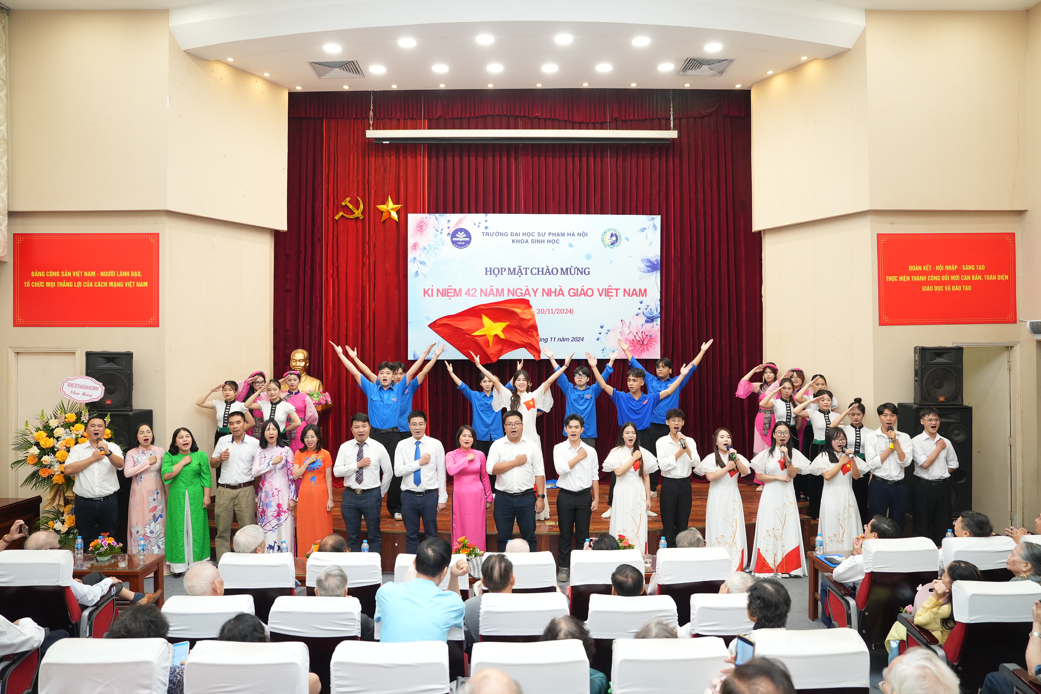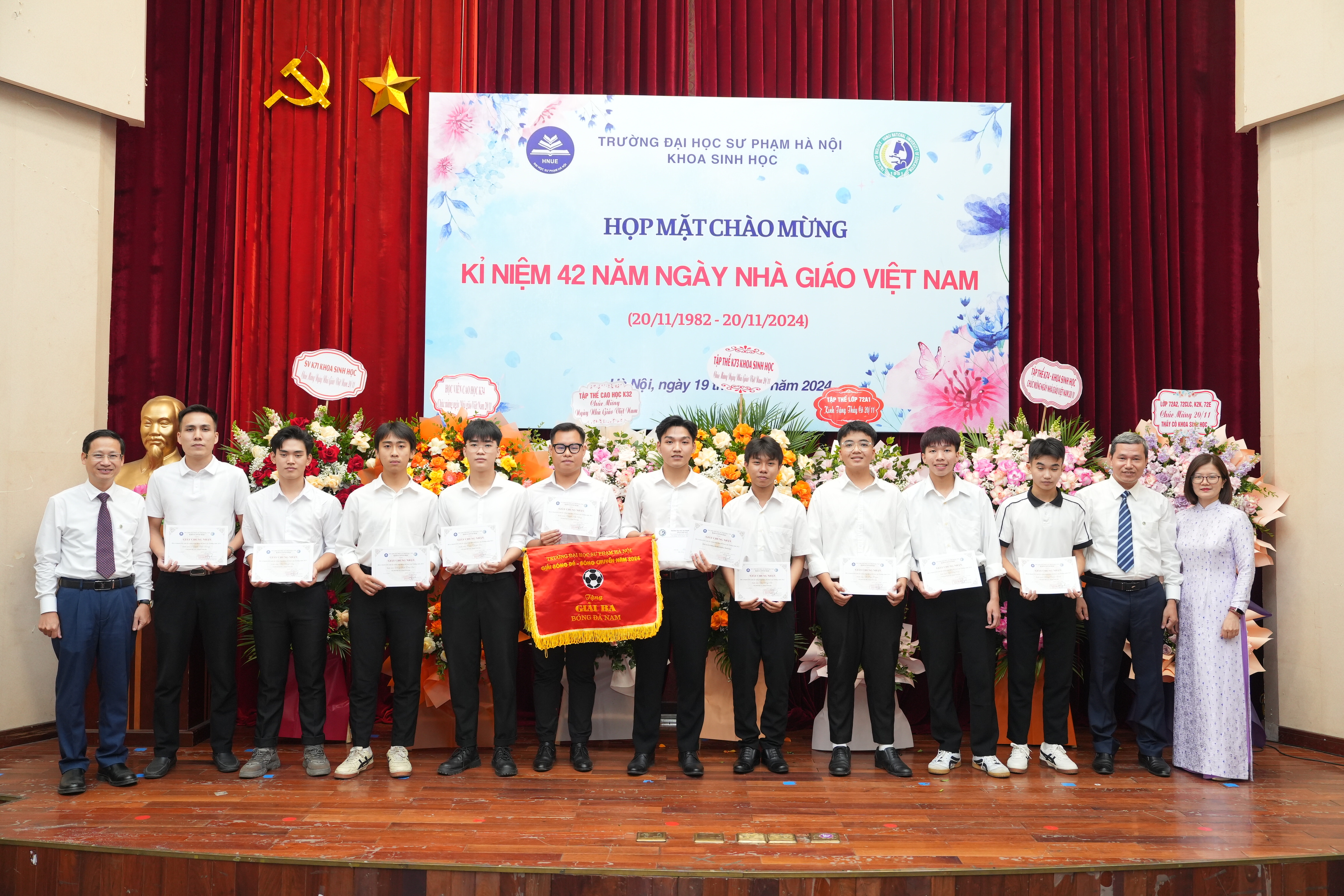 Đại diện sinh viên, cao học và nghiên cứu sinh tặng hoa chúc mừng và bày tỏ lòng biết ơn sâu sắc tới các thế hệ thầy cô, các em rất tự hào vì đã được học và trưởng thành tại ngôi nhà Khoa Sinh học, trường Đại học Sư phạm Hà Nội.