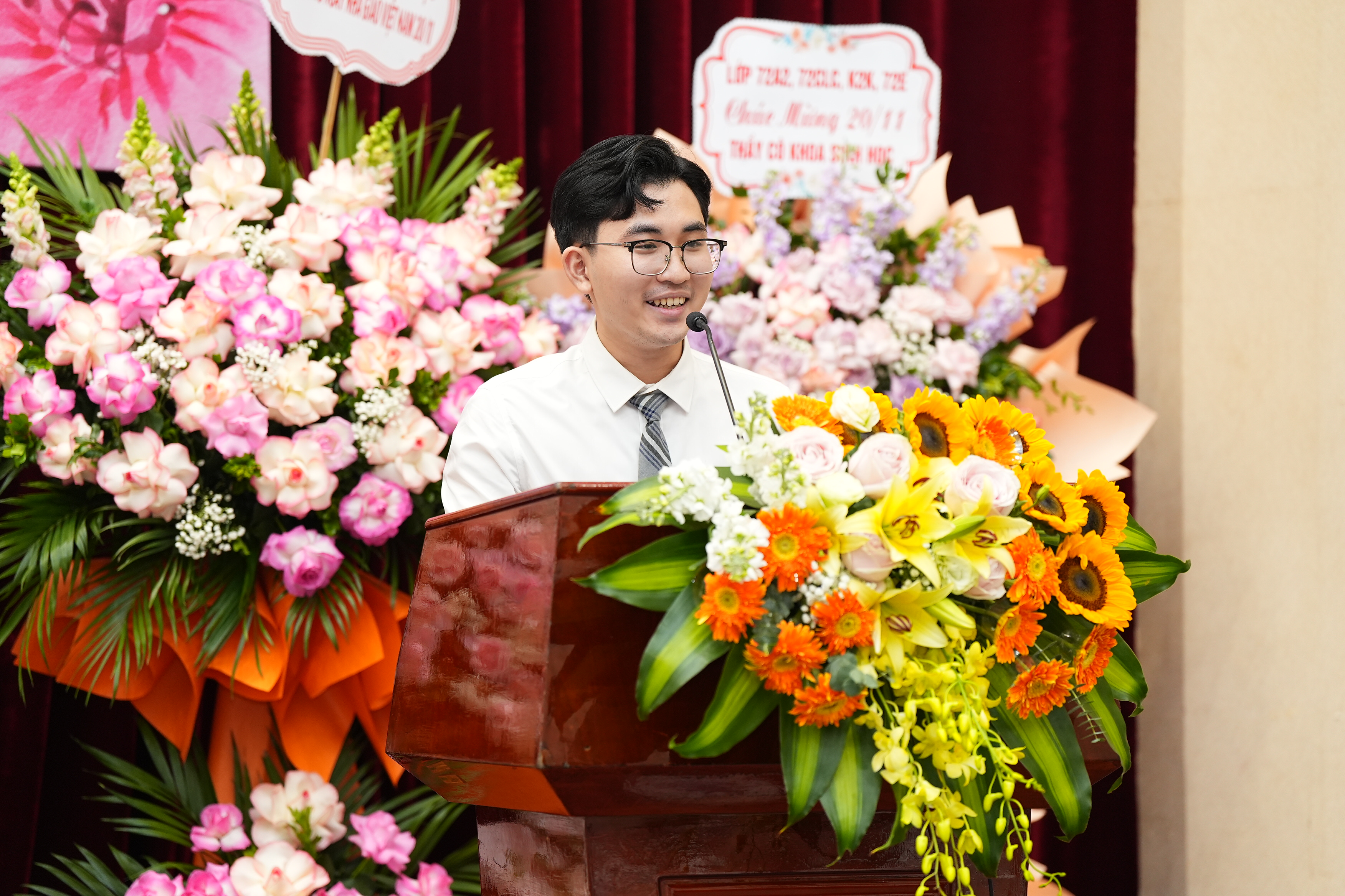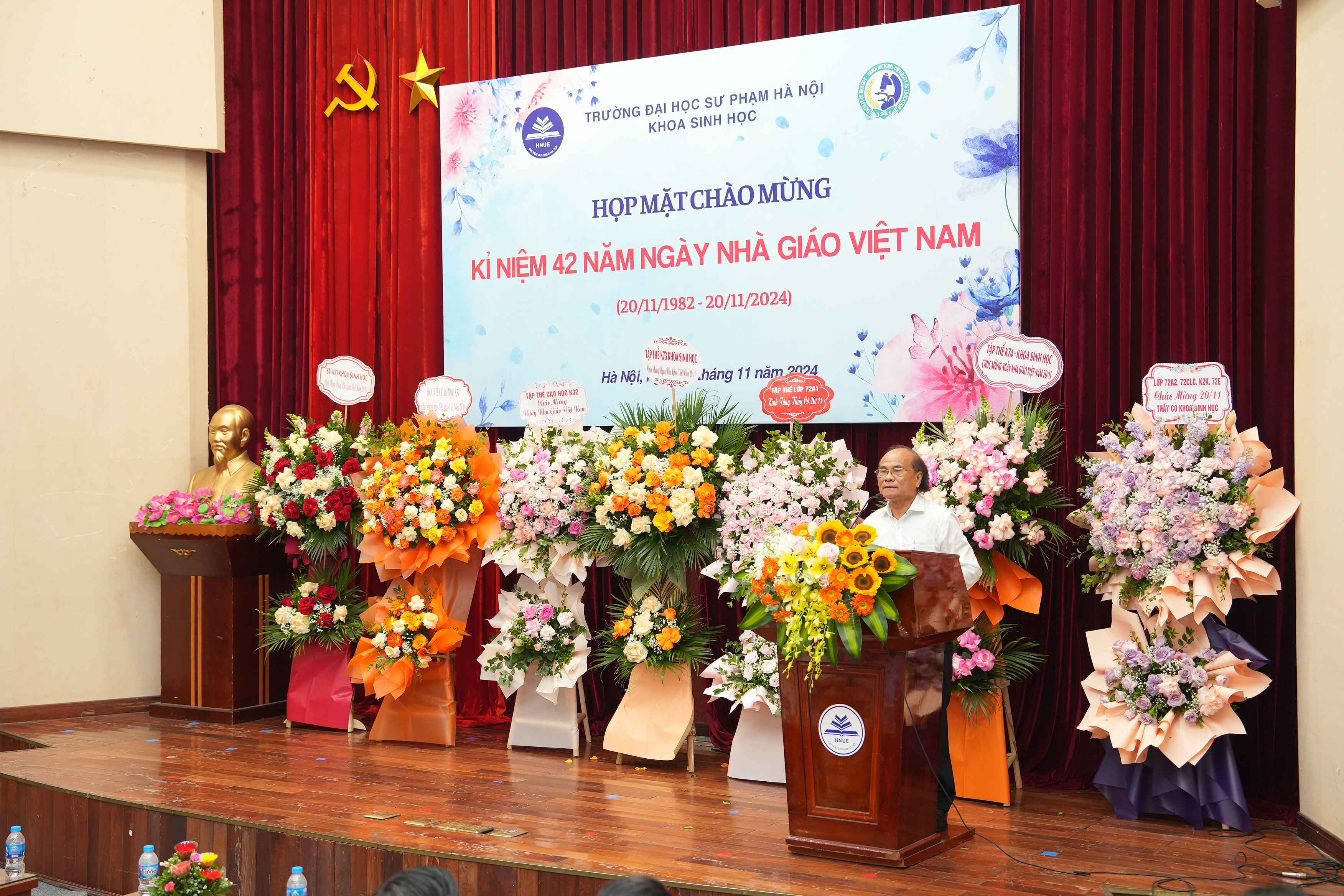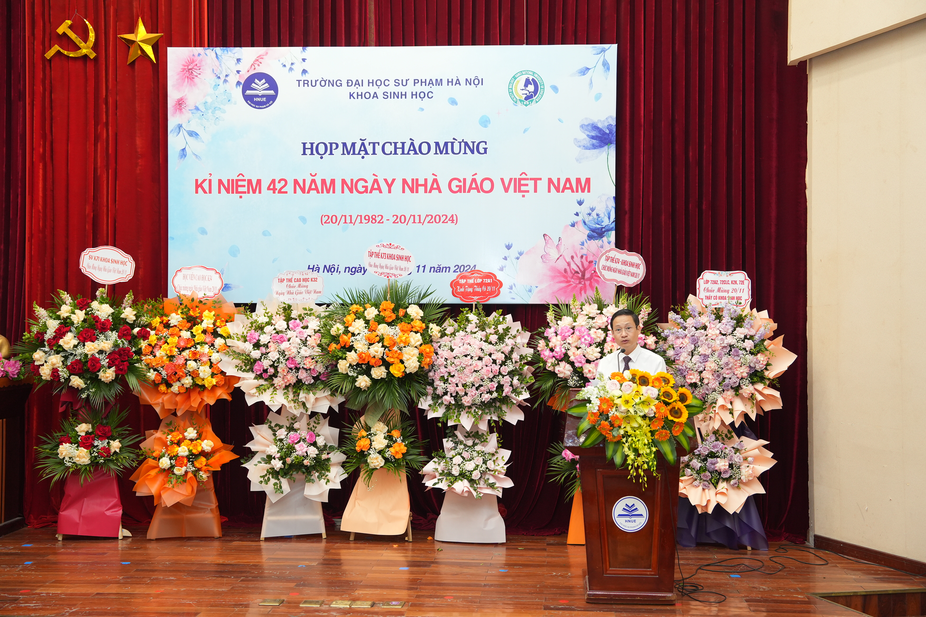 Buổi lễ chính thức bắt đầu với bài phát biểu của PGS.TS. Nguyễn Lân Hùng Sơn – Bí thư Đảng ủy Khoa, Trưởng Khoa Sinh học. Tiếp nối truyền thống của lớp lớp thế hệ thầy và trò, niềm tin yêu của cả xã hội các thế hệ thầy và trò khoa Sinh học hiện nay nỗ lực không ngừng, đóng góp công sức, trí tuệ vào sự nghiệp giáo dục. Đội ngũ cán bộ của Khoa hiện nay gồm 14 Phó Giáo sư, 20 Tiến sĩ trong số 47 cán bộ cũng như phương hướng phát triển trong thời gian tới của Khoa. Nhìn lại một số điểm nổi bật trong hoạt động của Khoa năm qua trong công tác hợp tác quốc tế, kỳ thi Olympic Sinh học sinh viên toàn quốc lần thứ 4, NCKH, Hội nghị khoa học quốc gia về Nghiên cứu và Giảng dạy Sinh học lần thứ 6 phối hợp tổ chức với Trường Đại học Sư phạm - ĐH Huế và 12 trường Đại học trong cả nước tổ chức thành công về NC & GDSH ở Việt Nam. Bài phát biểu của thầy Trưởng khoa cũng đề cập tới vai trò, trách nhiệm và vinh quang của nghề giáo trong nền giáo dục mới cũng như những kết quả cao của các hoạt động phong trào của cán bộ và sinh viên Khoa như: Giải A Hội diễn văn nghệ chào mừng ngày Nhà giáo Việt Nam, Giải Nhì toàn đoàn Nghiệp vụ sư phạm cấp Trường, Giải 3 bóng đá nam sinh viên, Giải 3 bóng chuyền nữ, Giải Ba cuộc thi Dance Storm hay SV Lê Thị Phương đạt tốp 20 nữ sinh xuất sắc nhận giải thưởng Nữ sinh khoa học công nghệ Việt Nam 2024 do Trung ương Đoàn và Bộ KH&CN trao tặng, Đội hình Trí thức trẻ tình nguyện tham gia xây dựng nông thôn mới của sinh viên khoa Sinh học tại xã Tân Bình, huyện Như Xuân, tỉnh Thanh Hóa với nhiều phần việc, công trình để lại ấn tượng tốt đẹp, tình thương với bà con và chính quyền địa phương…