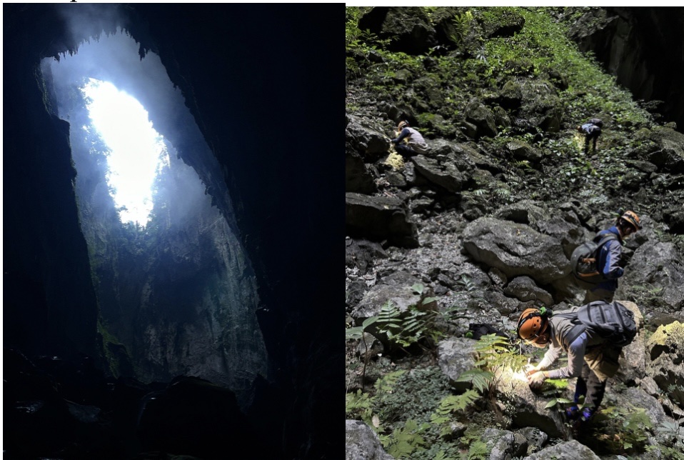 Ảnh 1. Hố sụt 1 và tác giả cùng nhóm nghiên cứu thu mẫu tại hố sụt 1