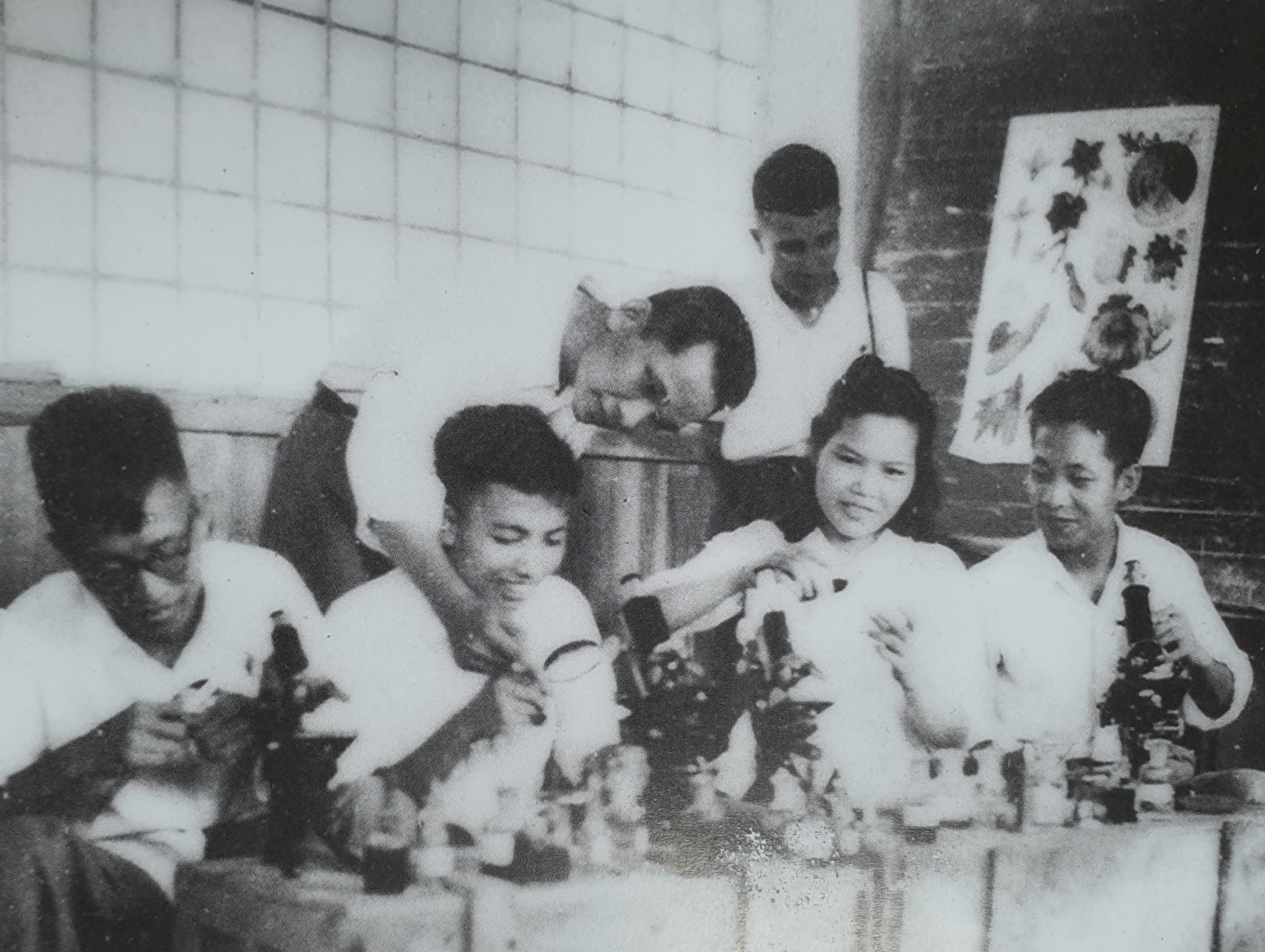 Ảnh 1. Giáo sư Lê Khả Kế hướng dẫn những sinh viên đầu tiên của khoa Sinh học thực hành tại Khu học xá Trung ương năm 1953