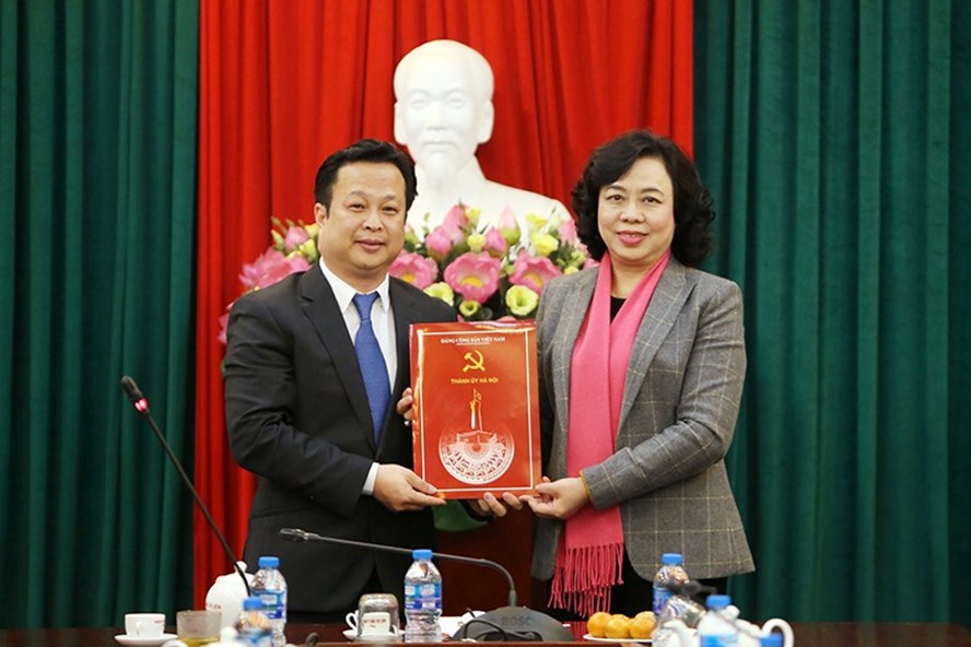Ảnh 3. Ủy viên Trung ương Đảng, Phó Bí thư Thường trực Thành ủy Hà Nội Ngô Thị Thanh Hằng (cựu sinh viên khoa Sinh học) trao Quyết định cho đồng chí Trần Thế Cương (cựu sinh viên khóa 42 khoa Sinh học) giữ chức Phó Bí thư Quận ủy Bắc Từ Liêm và giới thiệu HĐND bầu Chủ tịch UBND Quận Bắc Từ Liêm, thành phố Hà Nội ngày 7/1/2019 (nguồn: Cổng thông tin Hà Nội).
