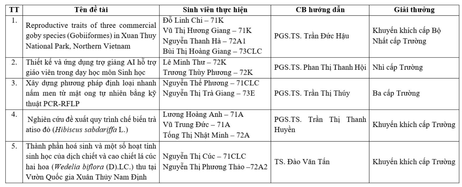 Với sự tận tâm hướng dẫn của thầy cô và tinh thần làm việc nghiêm túc, sáng tạo của sinh viên, cả 5 đề tài của Khoa Sinh học đều đạt giải cấp Trường, trong đó có 01 Giải Nhất, 01 Giải Nhì, 01 Giải Ba và 02 Giải Khuyến khích (Bảng 1). Đặc biệt, sau một số năm vắng tên trong danh sách giải thưởng NCKH cấp Bộ, năm 2025 Khoa Sinh học đã có sinh viên được vinh danh với Giải Khuyến khích, thuộc về đề tài của nhóm sinh viên Đỗ Linh Chi – K71K, dưới sự hướng dẫn của PGS.TS. Trần Đức Hậu (Bộ môn Động vật học). Đề tài này đồng thời đạt Giải Nhất cấp Trường, tạo dấu ấn nổi bật cho Khoa tại Hội nghị.