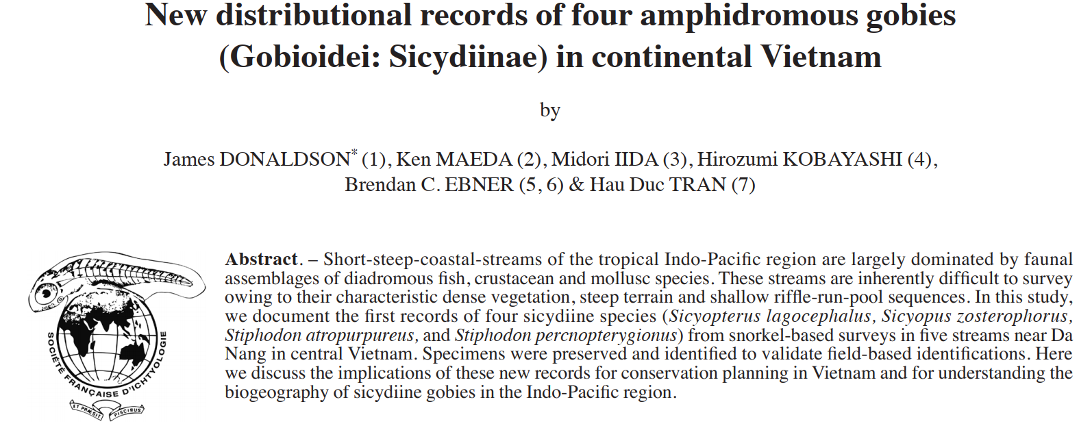 Suối ngắn, dốc, ven biển vùng nhiệt đới Ấn Độ - Thái Bình Dương là nơi tập trung nhiều loài cá, giáp xác, thân mềm thuộc dạng di cư sông – biển. Hệ thống suối như vậy gây khó khăn cho khảo sát vì thảm thực vật dày, địa hình dốc và nước cạn. Nghiên cứu này trình bày ghi nhận đầu tiên của bốn loài cá bống (Sicyopterus lagocephalus, Sicyopus zosterophorus, Stiphodon atropurpureus và Stiphodon percnopterygionus) được thu thập từ các đợt thực địa bằng lặn ống thở ở năm suối thuộc Đà Nẵng, miền Trung Việt Nam. Mẫu vật được cố định và định loại ngoài thực địa. Sự tập trung các loài ở suối trong nghiên cứu này khác hoàn toàn với suối rộng ở Đà Nẵng (như các nhánh của sông Hàn, chân núi Bà Nà), nơi phổ biến các loài không phải dạng di cư sông – biển, chỉ với một loài di cư (Stiphodon multisquamus). Ở khu vực nghiên cứu, thì ngược lại, với nhiều loài di cư sông – biển, chỉ thu được số ít các cá thể của cá nước ngọt không di cư (như Schistura carbonaria, Poropuntius sp.). Tương tự như vậy, khi so với các suối có đặc điểm như trong nghiên cứu này ở Nam Nhật Bản và Philippines, nơi phổ biến các loài cá bống dạng này và nhiều hơn so với suối ở lục địa của Đà Nẵng. Sự khác biệt này cho thấy tầm quan trọng trong bảo tồn của khu hệ cá ở suối ngắn, dốc ven biển. Bài báo cũng thảo luận áp dụng các ghi nhận này trong kế hoạch bảo tồn cá bống ở Việt Nam, góp phần hiểu biết về nhóm cá bống di cư đặc trưng này ở vùng Ấn Độ - Thái Bình Dương.