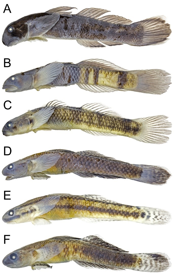 Hình 3. Mẫu vật định hình thu từ các đợt thực địa gần Đà Nẵng, Việt Nam: (A) Sicyopterus lagocephalus cái (73.2 mm SL, HNUE-F00295), (B) Sicyopus zosterophorus đực (39.8 mm SL, HNUE-F00296), (C) S. zosterophorus cái (43.4 mm SL, HNUE-F00296), (D) Stiphodon atropurpureus đực (34.5 mm SL, HNUE-F00298), (E) S. atropurpureus cái (35.8 mm SL, HNUE-F00298), (F) Stiphodon percnopterygionus đực (21.7 mm SL, HNUE-F00301)