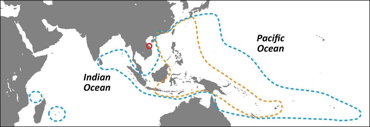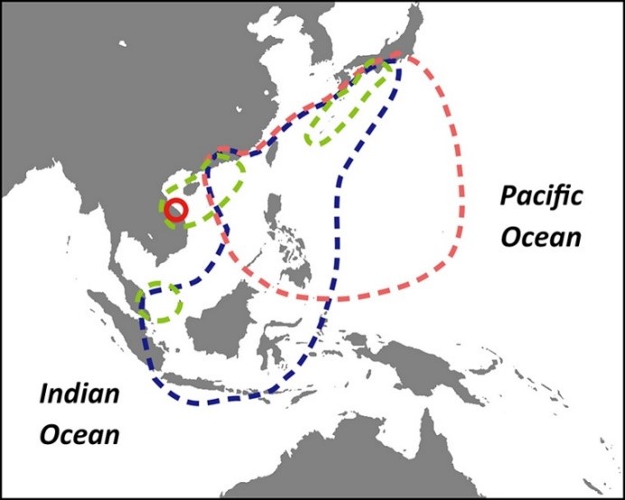 Hình 4. Bản đồ thể hiện sự phân bố của loài Sicyopterus lagocephalus (đường đứt đoạn xanh da trời) và Sicyopus zosterophorus (đường đứt đoạn màu vàng) từ các thông đã biết và vùng phân bố mới ghi nhận từ Việt Nam (vòng tròn đỏ)