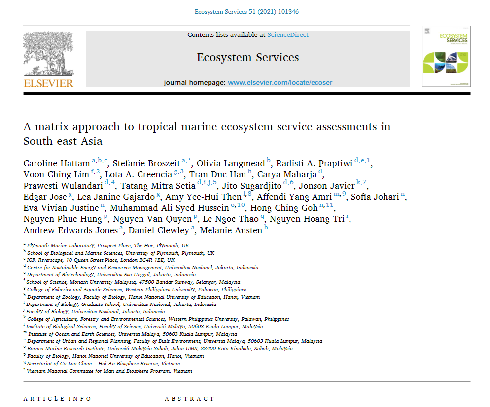 Nhóm tác giả của khoa Sinh học, Trường ĐHSPHN gồm: PGS.TS. Trần Đức Hậu, TS. Nguyễn Phúc Hưng, TS. Nguyễn Văn Quyền và GS.TS. Nguyễn Hoàng Trí cùng 23 tác giả khác đến từ 5 nước đã hợp tác nghiên cứu và công bố bài báo mới “A matrix approach to tropical marine ecosystem service assessments in South east Asia” trên Tạp chí quốc tế có uy tín (Q1). Dịch vụ hệ sinh thái (DVHST) là “Những lợi ích con người đạt được từ các hệ sinh thái, bao gồm dịch vụ cung cấp như thức ăn và nước, các dịch vụ điều tiết như điều tiết lũ lụt, hạn hán; các dịch vụ hỗ trợ như hình thành đất và chu trình dinh dưỡng; và các dịch vụ văn hóa như giải trí, tinh thần, tín ngưỡng và các lợi ích vật chất khác”. Nghiên cứu và áp dụng lĩnh vực này là cách tiếp cận mới trong bảo tồn đa dạng sinh học ở Việt Nam, quốc gia có tính đa dạng sinh học cao về số lượng loài, và đặc biệt là các hệ sinh thái ven biển. Trong khuôn khổ của Dự án Cộng đồng Xanh (Blue Communities), nhóm tác giả đến từ nhiều quốc gia khác nhau đã công bố bài báo trên tạp chí Ecosystem Services liên quan đến đánh giá DVHST của hệ sinh thái biển.