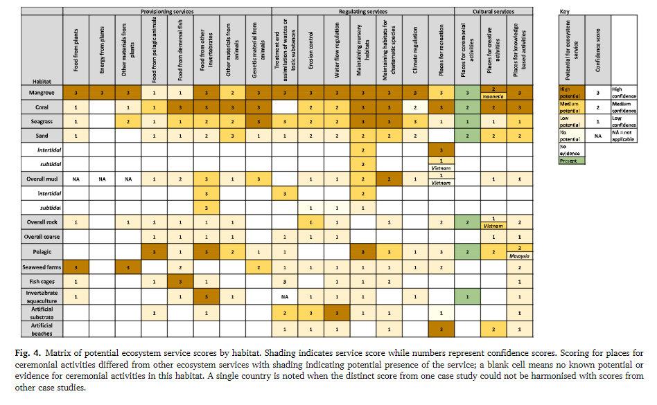 Ma trận bao gồm cả môi trường sống tự nhiên và môi trường nhân tạo, như là các đơn vị cung cấp dịch vụ. Tiềm năng DVHST cho các sinh cảnh được chấm điểm ở cấp độ lớn (ví dụ: rừng ngập mặn) do không đủ bằng chứng để cho điểm các cấp độ nhỏ (ví dụ: rừng ngập mặn rìa, lưu vực hoặc ven sông). Phần lớn bằng chứng có sẵn cho các môi trường sống sinh học (rừng ngập mặn, rạn san hô và thảm cỏ biển), tương đối ít đối với môi trường trầm tích. Trong khi các dịch vụ cung cấp, điều tiết và văn hóa được tính điểm, các bằng chứng được công bố nhiều hơn cho các dịch vụ cung cấp và điều tiết.