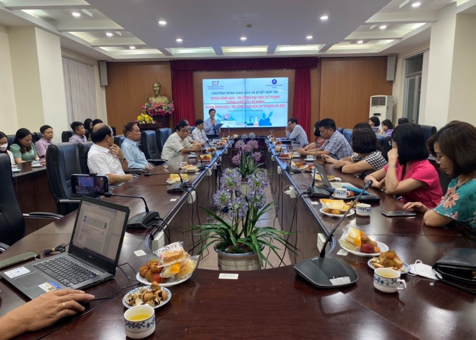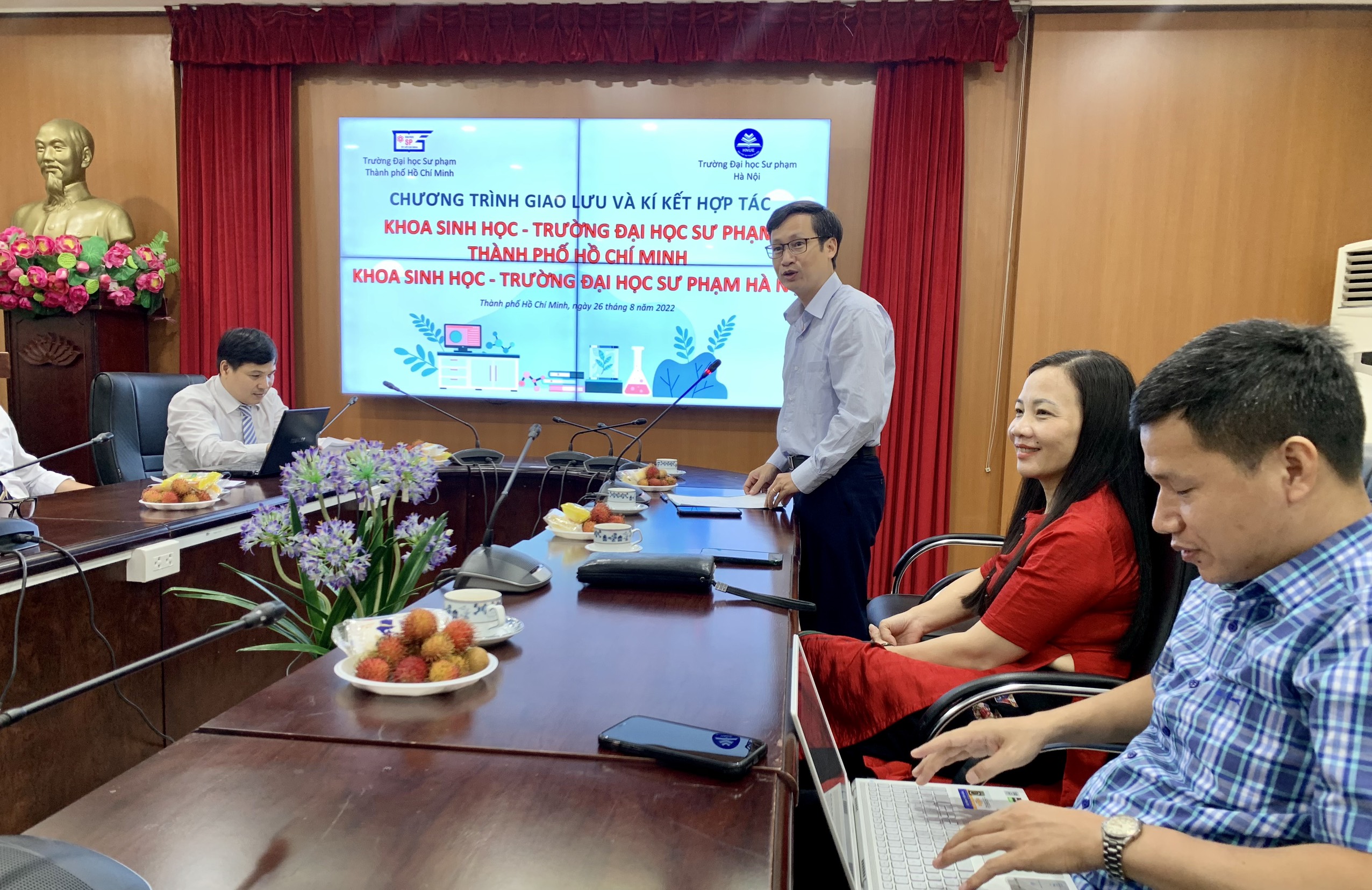 Thay mặt cho Khoa Sinh học, Trường ĐHSP TP Hồ Chí Minh, ThS. Quách Văn Toàn Em và TS. Phạm Cử Thiện - Phó Trưởng khoa đã giới thiệu ngắn gọn về cơ sở vật chất, đội ngũ cán bộ, chương trình đào tạo, nghiên cứu khoa học và hợp tác quốc tế của Khoa, qua đó đề xuất các nội dung, hướng hợp tác giữa hai khoa. Đáp lại các ý kiến trao đổi đó, PGS. TS. Nguyễn Lân Hùng Sơn đã chia sẻ một số thông tin cũng như kinh nghiệm của Khoa Sinh học, Trường ĐHSPHN trong công tác đào tạo đội ngũ cán bộ, giảng viên cũng như thúc đẩy các hoạt động phong trào của cán bộ, sinh viên, học viên trong toàn khoa.