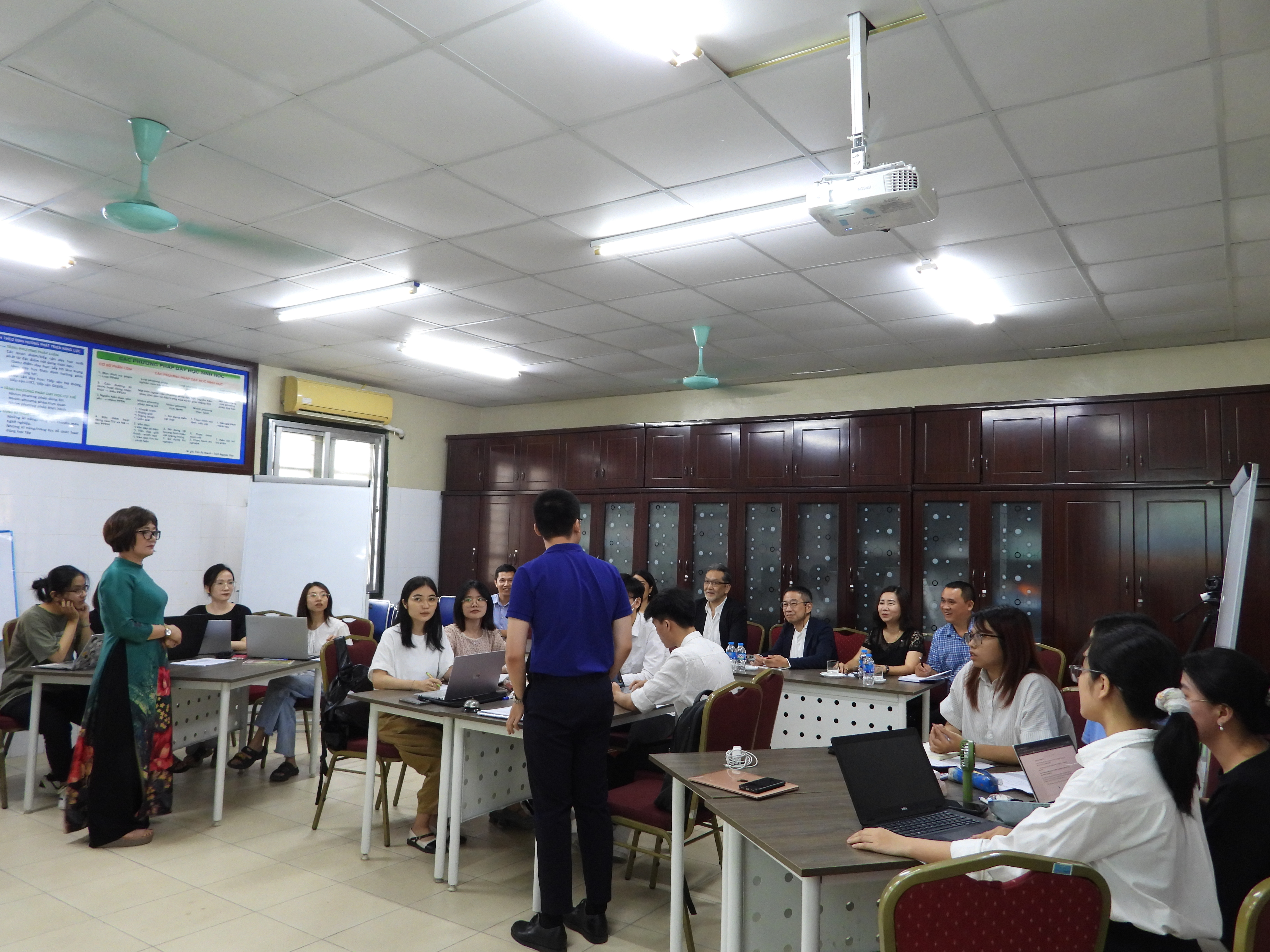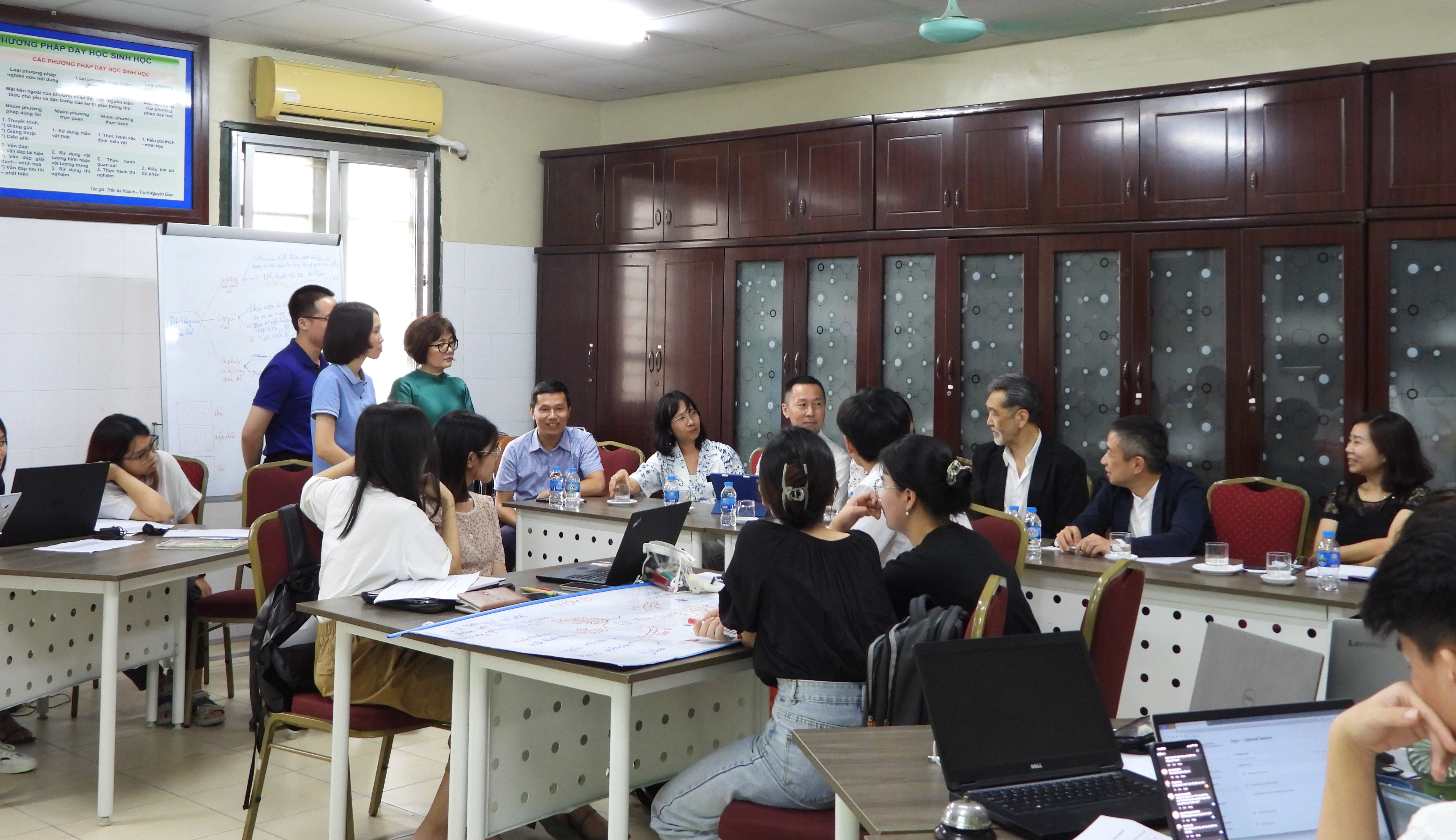 Ảnh 5. GS. Yoshimura, GS. Fugo trao đổi với TS. Nguyễn Thị Hằng Nga về một số hoạt động tổ chức trong tiết học
