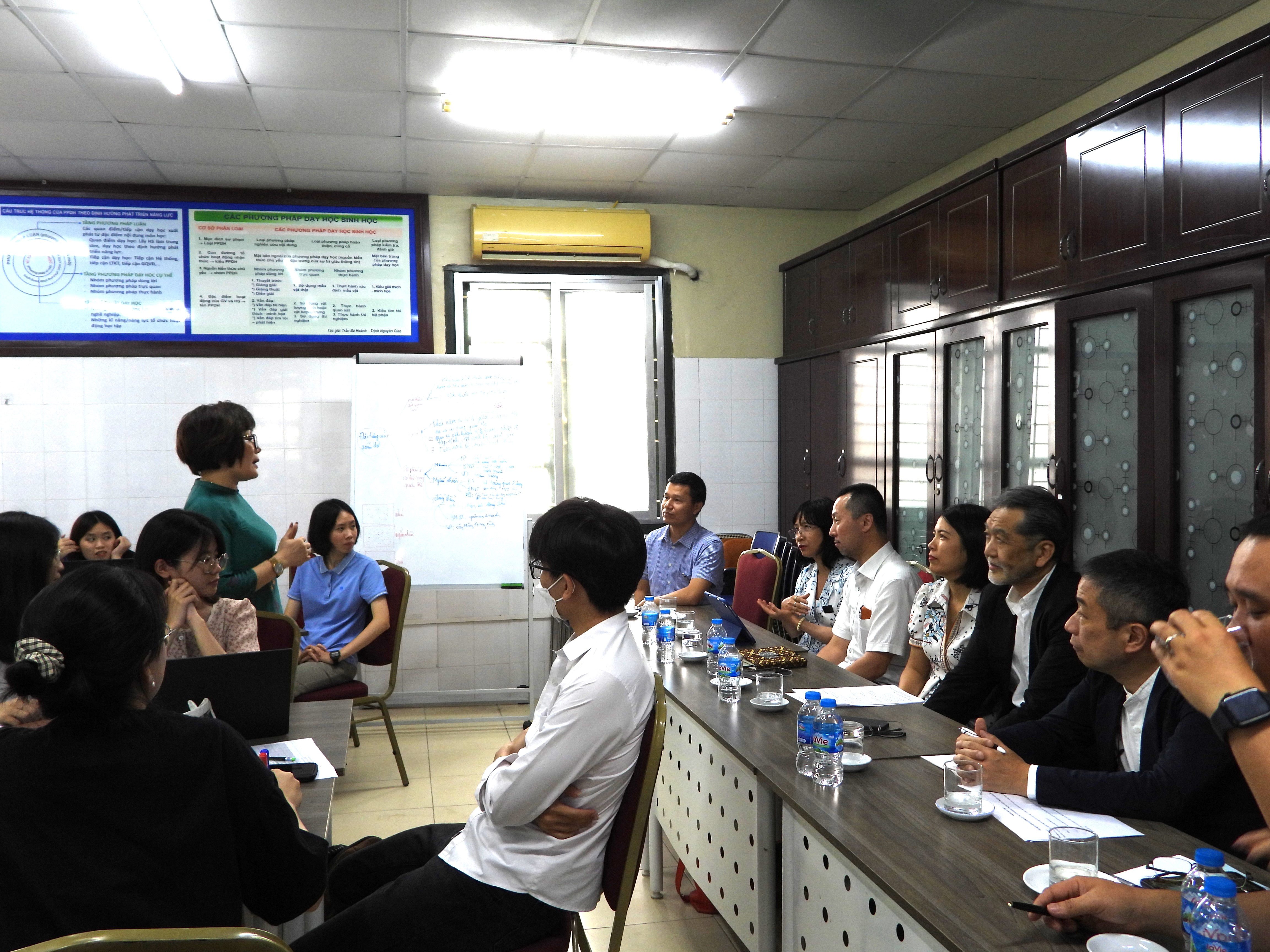Mở đầu buổi làm việc, PGS. TS. Nguyễn Lân Hùng Sơn – Trưởng Khoa Sinh học đã phát biểu, và cảm ơn các giáo sư đã tới thăm và làm việc tại Khoa Sinh học cũng như mong muốn có những trao đổi cụ thể để hoạt động hợp tác giữa hai đơn vị trong thời gian tới đạt hiệu quả cao. Để giúp các giáo sư có thêm thông tin về hoạt động đào tạo, các hướng nghiên cứu về giáo dục ở Khoa Sinh học, PGS.TS. Phan Thị Thanh Hội đã trình bày và giới thiệu Bộ môn Lý luận và Phương pháp dạy học Sinh học; các nhiệm vụ đào tạo đại học và sau đại học; một số kết quả đào tạo và nghiên cứu khoa học; một số hướng nghiên cứu của bộ môn đã và đang thực hiện và mong muốn phát triển trong giai đoạn tiếp theo đặc biệt là hướng đào tạo giáo viên vì sự phát triển bền vững.