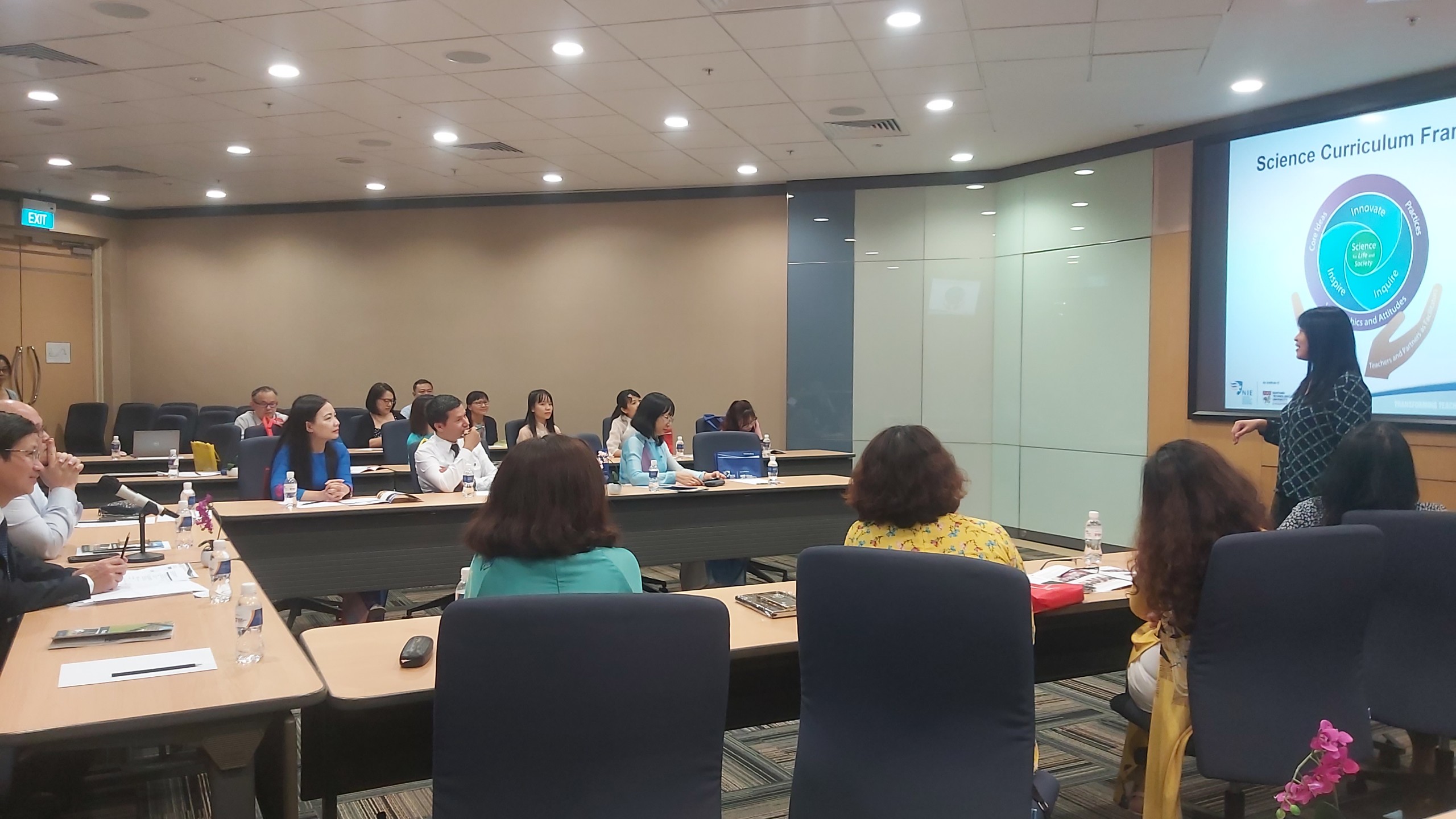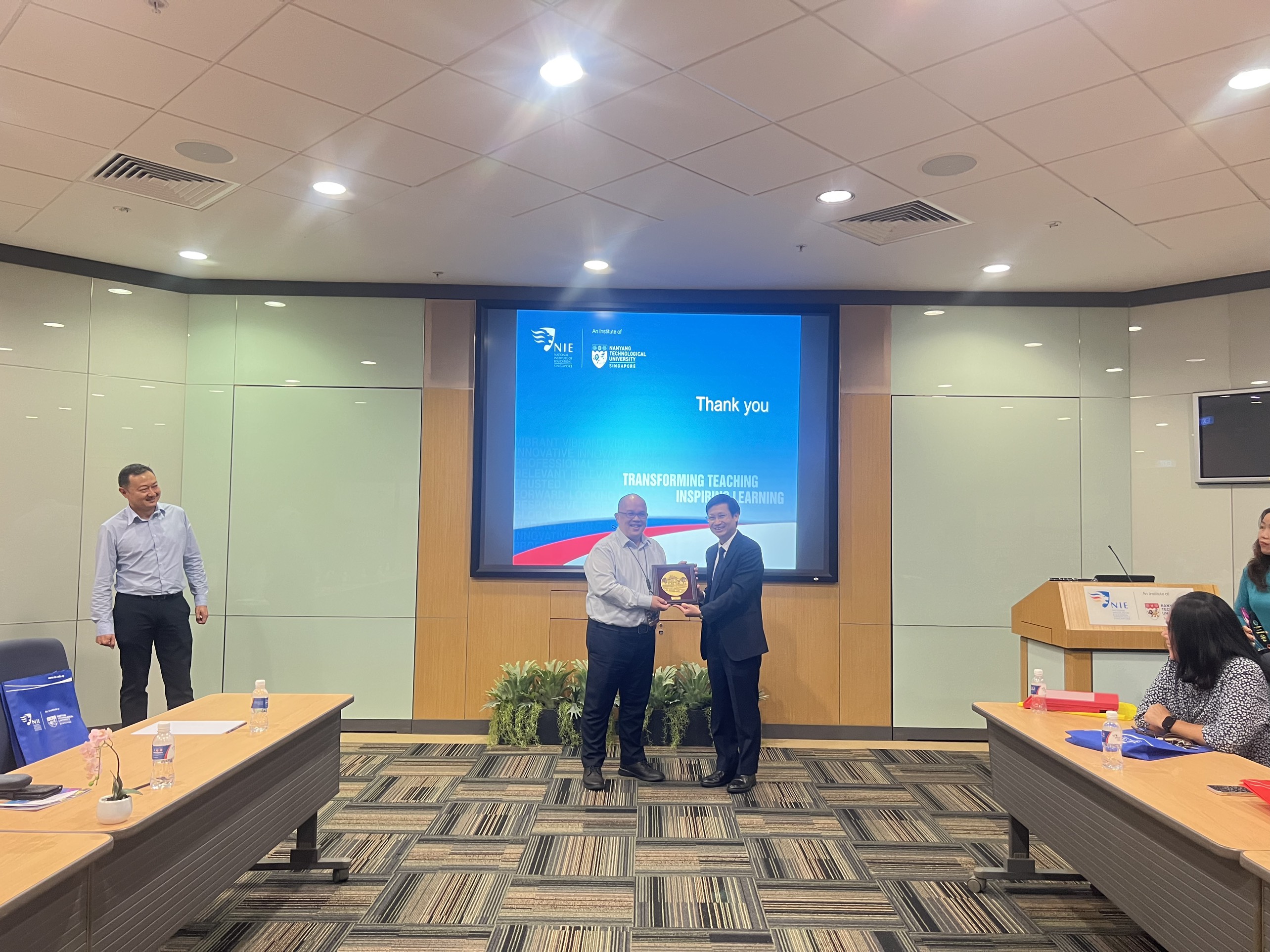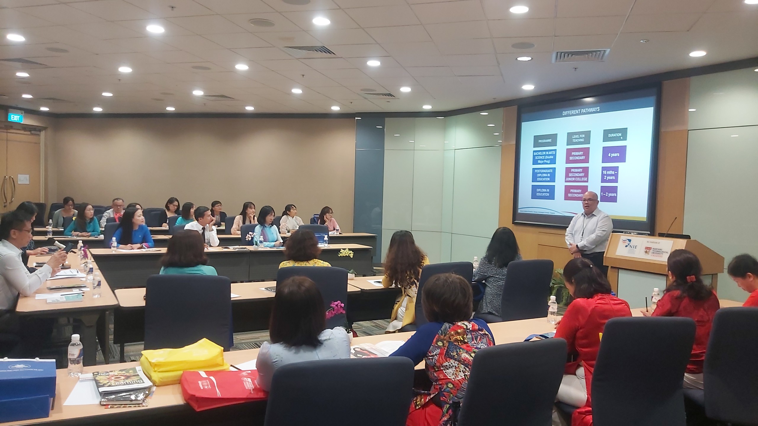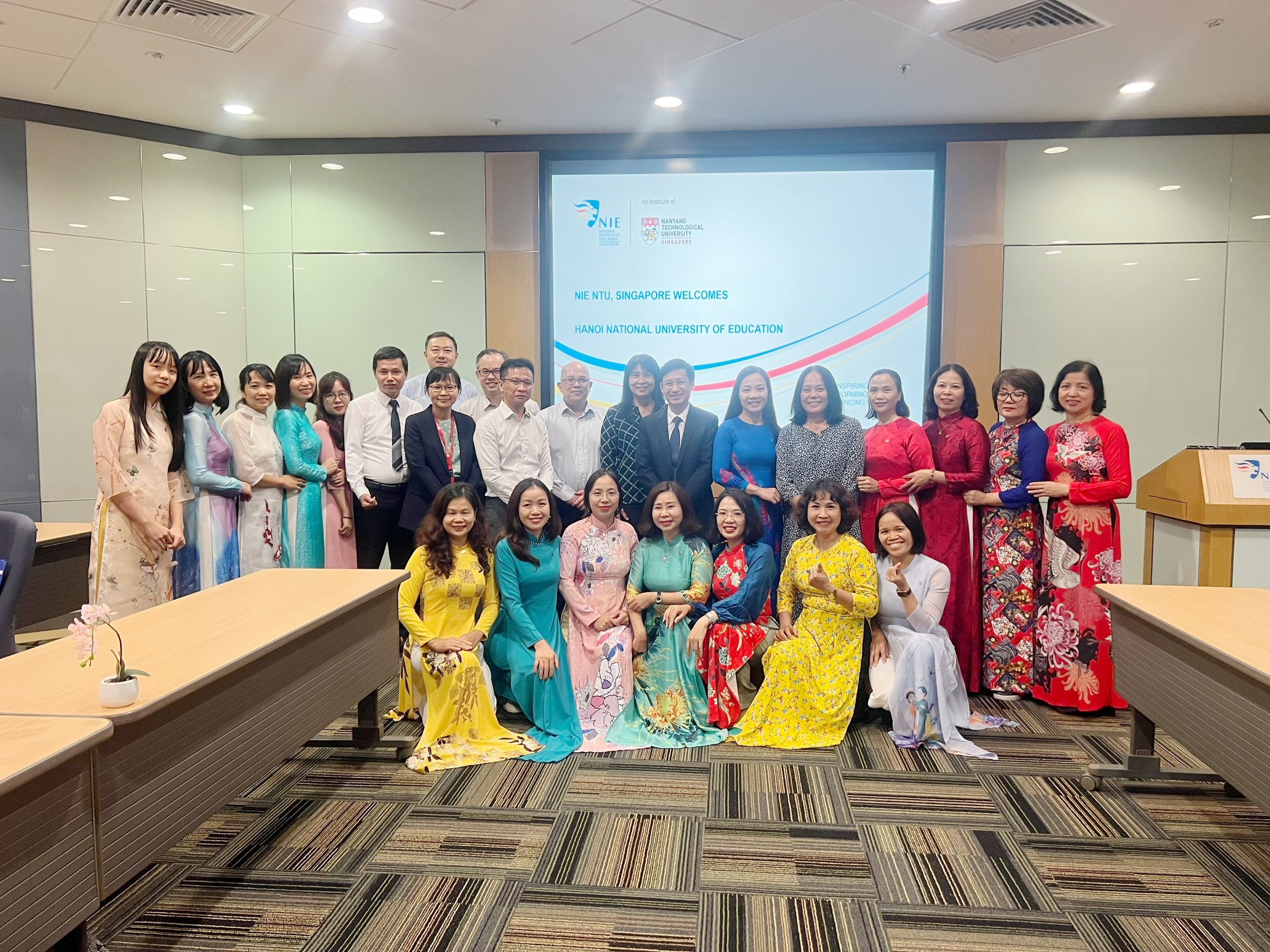 Viện Giáo dục Quốc gia Singapore (National Istitute of Education, Singapore - NIE) là một viện nghiên cứu thuộc Trường Đại học Công nghệ Nanyang (Nanyang Technological University - NTU). NIE được xếp hạng tốp 20 trong hệ thống các viện giáo dục trên thế giới và tốp 5 ở khu vực châu Á (theo QS). Tiếp đoàn về phía NIE có TS. Alexius Chia Ti Yong, Phó Trưởng khoa Thực hành và Đối tác, trường Đào tạo Giáo viên và PGS.TS. Hairon Salleh, Phó Trưởng khoa Đào tạo sau đại học, trường Đào tạo sau đại học và bồi dưỡng giáo viên cùng các giáo sư của Viện. Viện Giáo dục quốc gia Singapore (NIE) được trao quyền và trách nhiệm tuyển chọn, đào tạo, bồi dưỡng đội ngũ giáo viên, cán bộ lãnh đạo giáo dục của Singapore và là nơi nghiên cứu, cung cấp cơ sở lý luận và thực tiễn phục vụ quá trình hoạch định chính sách giáo dục quốc gia. Sau bài trình bày giới thiệu về Trường Đại học Sư phạm Hà Nội và Khoa Sinh học của PGS.TS. Nguyễn Lân Hùng Sơn, đoàn đã được nghe hai bài trình bày của TS. Alexius Chia Ti Yong về Chương trình chuẩn bị cho giáo viên ban đầu và của PGS.TS. Tan Aik Ling về Giáo dục khoa học và nghiên cứu trong sinh học, khoa học sự sống và khoa học giáo dục. Qua phần trình bày của các chuyên gia NIE và phần trao đổi có thể thấy NIE và Bộ Giáo dục Singapore cùng các trường học trong cả nước đã hợp tác chặt chẽ để thực hiện sứ mệnh và tầm nhìn về đào tạo các thế hệ giáo viên có tư duy sáng tạo theo tiêu chuẩn toàn cầu. Từ những thập niên cuối thế kỉ XX, chính phủ Singapore đã triển khai chương trình “Nhà trường tư duy, quốc gia học tập” (Thinking Schools, Learning Nation), tiếp theo là chương trình “Dạy ít, học nhiều” (Teach less, learn more). Các chương trình đều hướng đến mục tiêu khích lệ học sinh tích cực học tập những vấn đề gắn liền với thực tiễn, phục vụ nhu cầu cá nhân, xã hội, phụng sự quốc gia đồng thời đáp ứng xu hướng phát triển của thế giới. Hệ thống giáo dục Singapore đặt mục tiêu cao nhất cho việc phát huy tiềm năng người học, lấy đó làm cơ sở để phát triển nền kinh tế tri thức. Chương trình đào tạo đại học và sau đại học ở NIE đều được triển khai theo Mô hình Giáo dục giáo viên cho thế kỷ XXI (Teacher Education for the 21st Century) với những khung giá trị, kiến thức, kỹ năng cần thiết cho giáo viên tương lai. Theo đó hướng tới đào tạo đội ngũ giáo viên có khả năng liên tục sáng tạo kiến thức chứ không chỉ hấp thu kiến thức; đề xuất phương pháp học tập hiệu quả chứ không chỉ truyền đạt những điều đã học; kiến tạo môi trường học tập cho học sinh chứ không chỉ thực thi yêu cầu từ người khác; kiến tạo nên các thế hệ học sinh phát triển cá tính riêng biệt chứ không chỉ là thành viên đơn thuần trong lớp; và giáo viên là những người dẫn đầu sự thay đổi trong giáo dục chứ không chỉ chạy theo sự đổi mới. Trả lời trăn trở về kinh nghiệm đào tạo và bồi dưỡng giáo viên dạy môn khoa học tự nhiên ở phổ thông, PGS.TS. Tan Aik Ling chia sẻ cần có sự hợp tác giữa các chuyên gia về khoa học cơ bản và khoa học giáo dục. Các thầy về khoa học cơ bản sẽ hệ thống hóa các mạch kiến thức khoa học đảm bảo tính chính xác, cập nhật và phù hợp với năng lực tư duy nhận thức ở từng cấp học. Còn những người như chúng tôi, các nhà khoa học giáo dục sẽ hỗ trợ để tổ chức các hoạt động giáo dục với các phương pháp dạy học phù hợp để học sinh có thể lĩnh hội được tri thức và phát triển được những năng lực mà nhà giáo dục hướng tới. Trước khi rời NIE, đoàn đã được đưa đi thăm một số cơ sở vật chất phục vụ đào tạo, nghiên cứu của viện như thư viện, giảng đường, phòng thí nghiệm, thực hành, phòng học số, phòng học STEM, căng tin, … tất cả được đan xen trong một không gian xanh của đa dạng các loài cây.