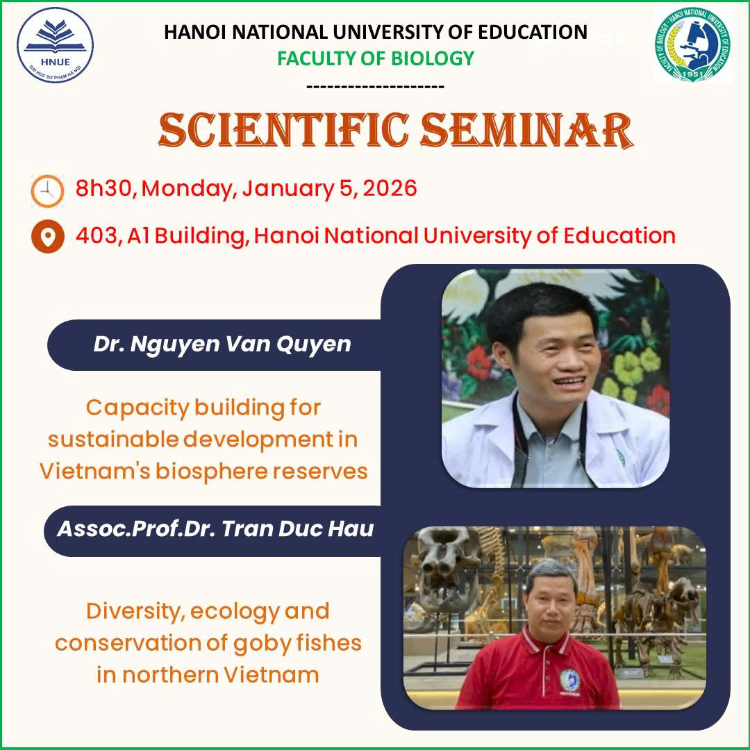 Nhằm tăng cường hoạt động trao đổi học thuật và thúc đẩy việc sử dụng tiếng Anh trong đội ngũ cán bộ, Khoa Sinh học dự kiến tổ chức Seminar khoa học vào ngày 05 tháng 01 năm 2026, với sự tham gia báo cáo của hai báo cáo viên: