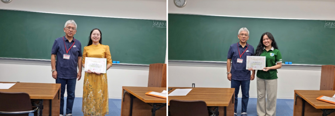 Ảnh 13. GS. Ando trao Giấy chứng nhận hoàn thành khóa học cho 2 sinh viên khoa Sinh học, Trường ĐHSP Hà Nội