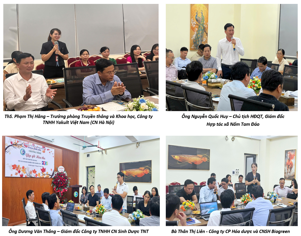 Đại diện các doanh nghiệp chia sẻ những câu chuyện khởi nghiệp đầy cảm hứng, mong muốn truyền động lực cho sinh viên Khoa Sinh học và khẳng định tinh thần đồng hành cùng Khoa trong công tác đào tạo. Các doanh nghiệp bày tỏ sẵn sàng hỗ trợ cơ sở vật chất, phòng thí nghiệm và nhà xưởng phục vụ hoạt động thực tập, nghiên cứu, đặc biệt đối với sinh viên ngành Công nghệ Sinh học và Cử nhân Sinh học, đồng thời mở rộng cơ hội việc làm cho sinh viên sau khi tốt nghiệp. Ông Đỗ Quốc Huy – Chủ tịch Hội đồng quản trị, Giám đốc HTX Nấm Tam Đảo và ông Dương Văn Thắng – Giám đốc Công ty TNHH Công nghệ Sinh Dược TNT, thông qua câu chuyện phát triển doanh nghiệp của mình, đã nhấn mạnh vai trò của hoạt động đào tạo tại Khoa trong việc hình thành năng lực nghề nghiệp, đồng thời chia sẻ những khó khăn mà sinh viên gặp phải khi gắn kết giữa học tập và thực tiễn. Qua đó, các ông bày tỏ mong muốn được hợp tác lâu dài và hỗ trợ Khoa trong công tác đào tạo và hỗ trợ sinh viên thực tập, khởi nghiệp.