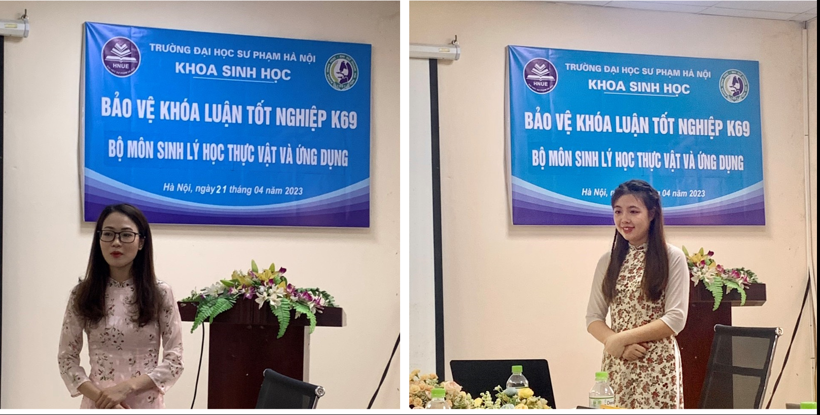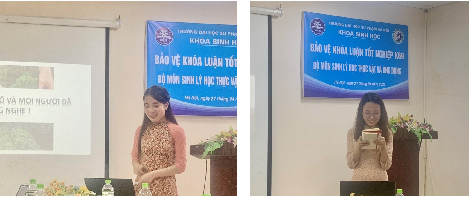 Trong năm học 2022 - 2023, Bộ môn Sinh lý học thực vật và Ứng dụng có 4 sinh viên tham gia thực hiện đề tài khóa luận tốt nghiệp bao gồm: sinh viên Bùi Việt Hà (lớp CLC), Nguyễn Thị Ánh Sao (lớp CLC), Khương Thanh Nhàn (lớp A) và Nguyễn Thị Phương Thúy (lớp A) dưới sự hướng dẫn của TS. Trần Khánh Vân và TS. Lê Thị Thủy. Các đề tài khóa luận tốt nghiệp được các bạn sinh viên triển khai từ khá sớm và đi theo định hướng nghiên cứu chung của bộ môn, đồng thời thể hiện tính ứng dụng cao với các nghiên cứu liên quan đến việc hoàn thiện quy trình canh tác các đối tượng cây trồng mới như cây sachi hay ứng dụng kỹ thuật thủy canh trong sản xuất các loại cây rau ăn lá và rau gia vị như thì là, cải kale. Bên cạnh đó, nghiên cứu quy trình sản xuất trà túi lọc từ lá sachi kết hợp với cam thảo và lá nếp là hướng nghiên cứu mới đã được sinh viên Bùi Thị Việt Hà thực hiện thành công, đề tài cũng đã đạt giải Nhì trong Hội nghị sinh viên nghiên cứu khoa học cấp Khoa.
