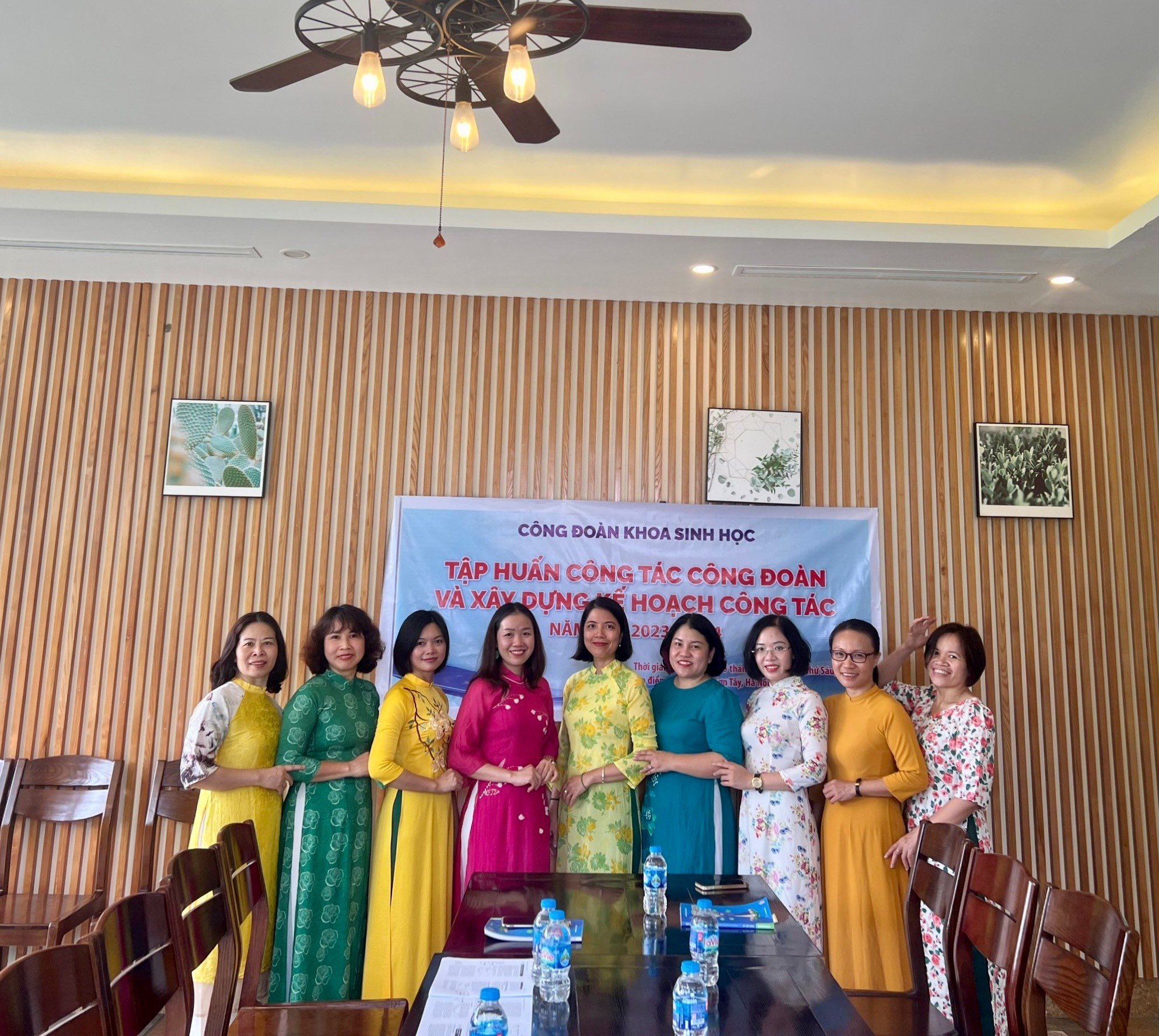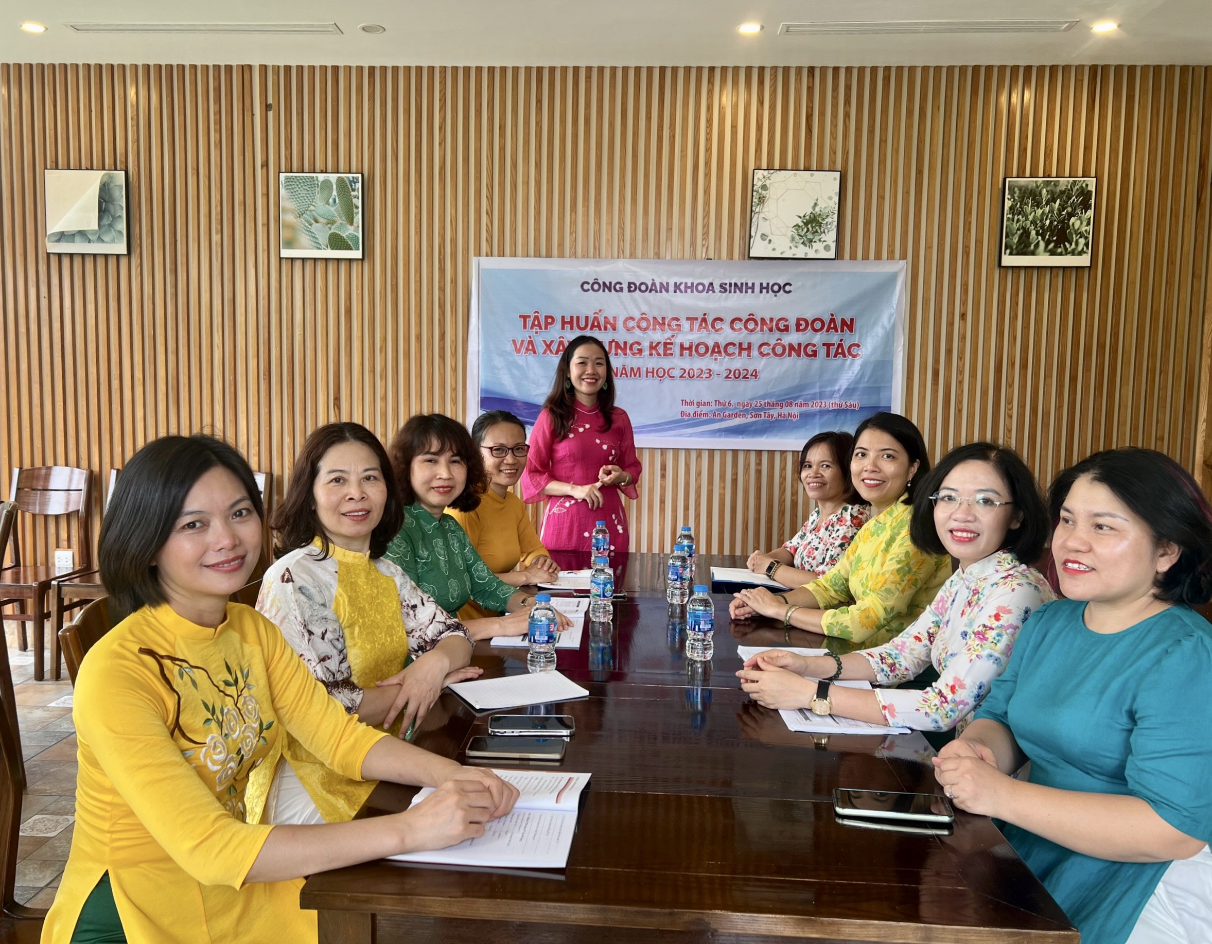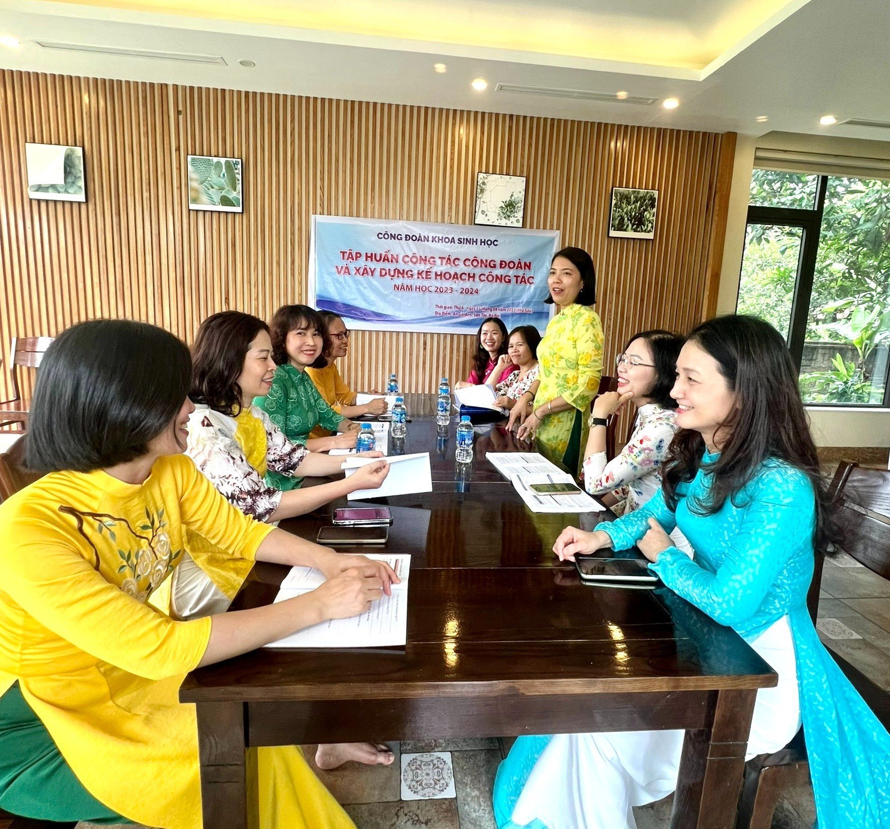 Xuất phát lúc 6 giờ 45 phút từ Khoa Sinh học, đoàn chúng tôi đã đặt chân đến địa điểm tập huấn tại An Garden đúng 8h00. Buổi tập huấn diễn ra vào lúc 8h15 đến 11h15 cùng ngày. Tại buổi tập huấn, các đồng chí cùng chia sẻ, rút kinh nghiệm về các mặt công tác công đoàn trong năm học vừa qua cũng như đề xuất một số giải pháp để nâng cao hiệu quả trong năm học tới.