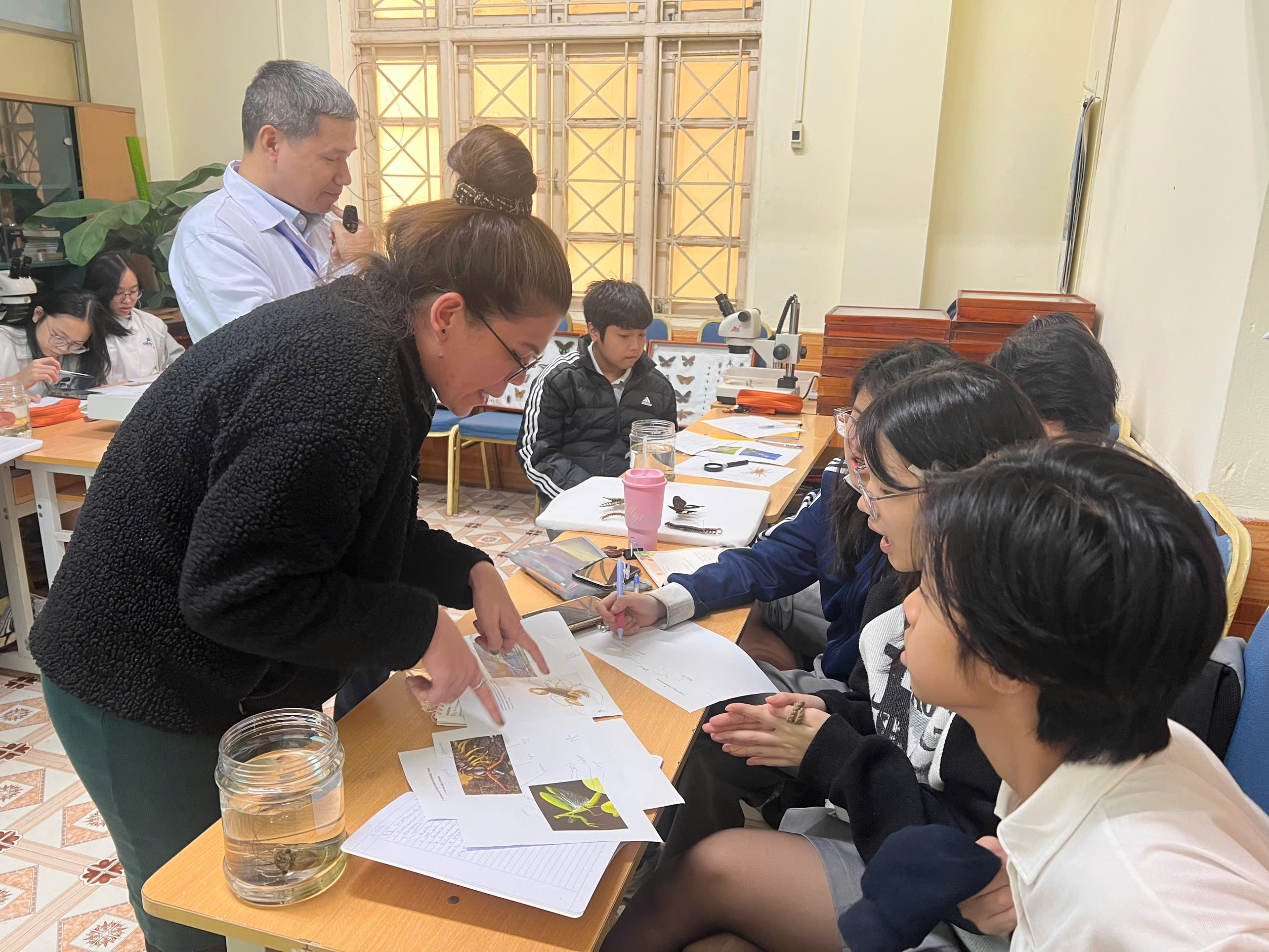 Phần tiếp theo của buổi trải nghiệm, học sinh tham gia hoạt động thực hành theo nhóm. Mỗi nhóm được cung cấp 5 mẫu côn trùng phổ biến ở Việt Nam để tiến hành định loại bằng khóa lưỡng phân dưới sự hướng dẫn của giảng viên và trợ giảng. Các học sinh thảo luận sôi nổi để xác định tên bộ của các mẫu vật. Sau đó, mỗi nhóm làm việc trên 4 ảnh màu của các đại diện thuộc ngành Chân khớp để điền thông tin về đặc điểm cấu tạo ngoài cơ bản. Các nhóm nhanh chóng hoàn thành nhiệm vụ và xây dựng khóa lưỡng phân cho các mẫu qua hình ảnh. Một hoạt động thực hành thú vị khác là quan sát, mô tả và vẽ các mẫu sống tôm hoặc cua. Hoạt động này không chỉ khơi dậy sự hứng thú mà còn khuyến khích sáng tạo của học sinh qua từng nét bút và nét vẽ.