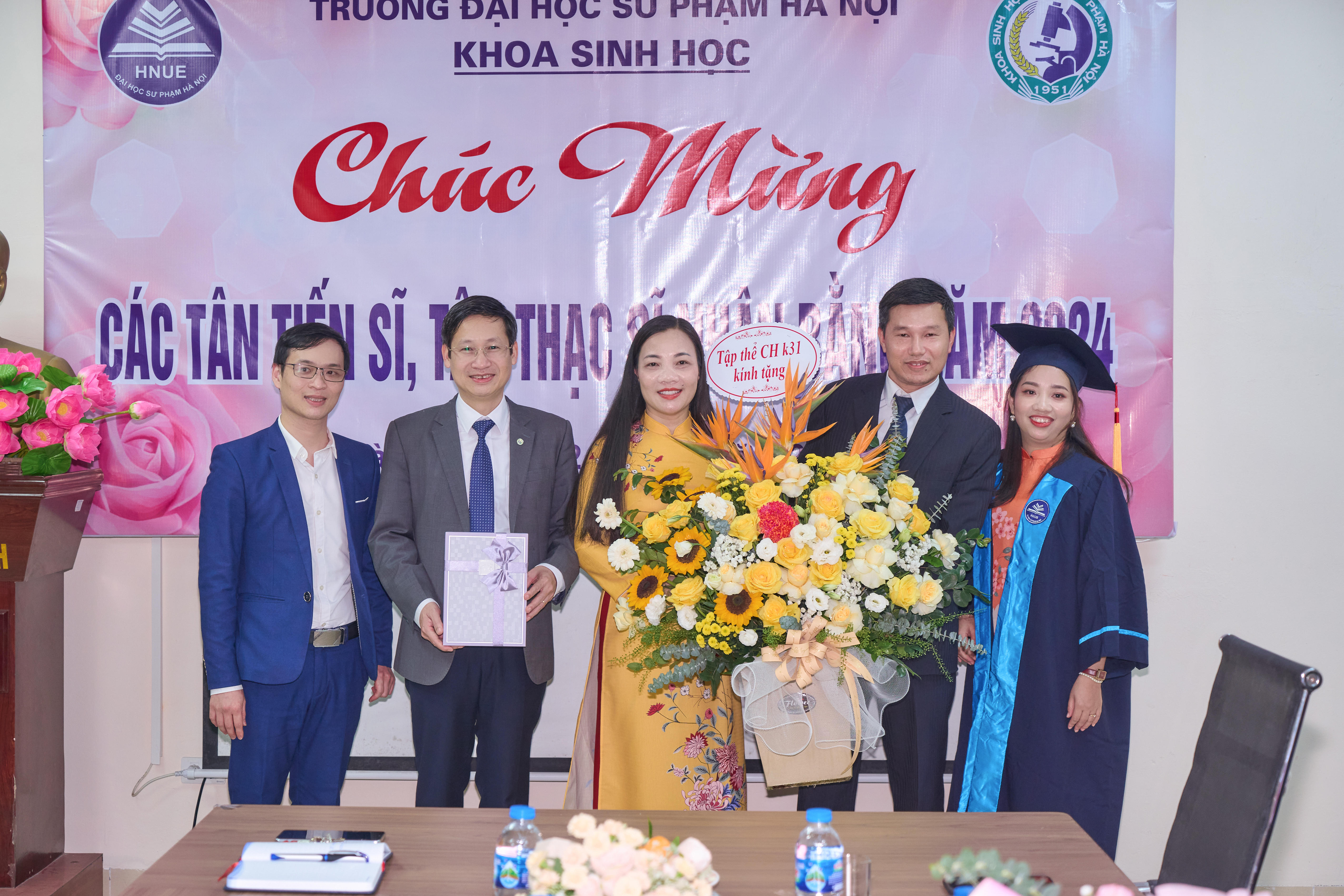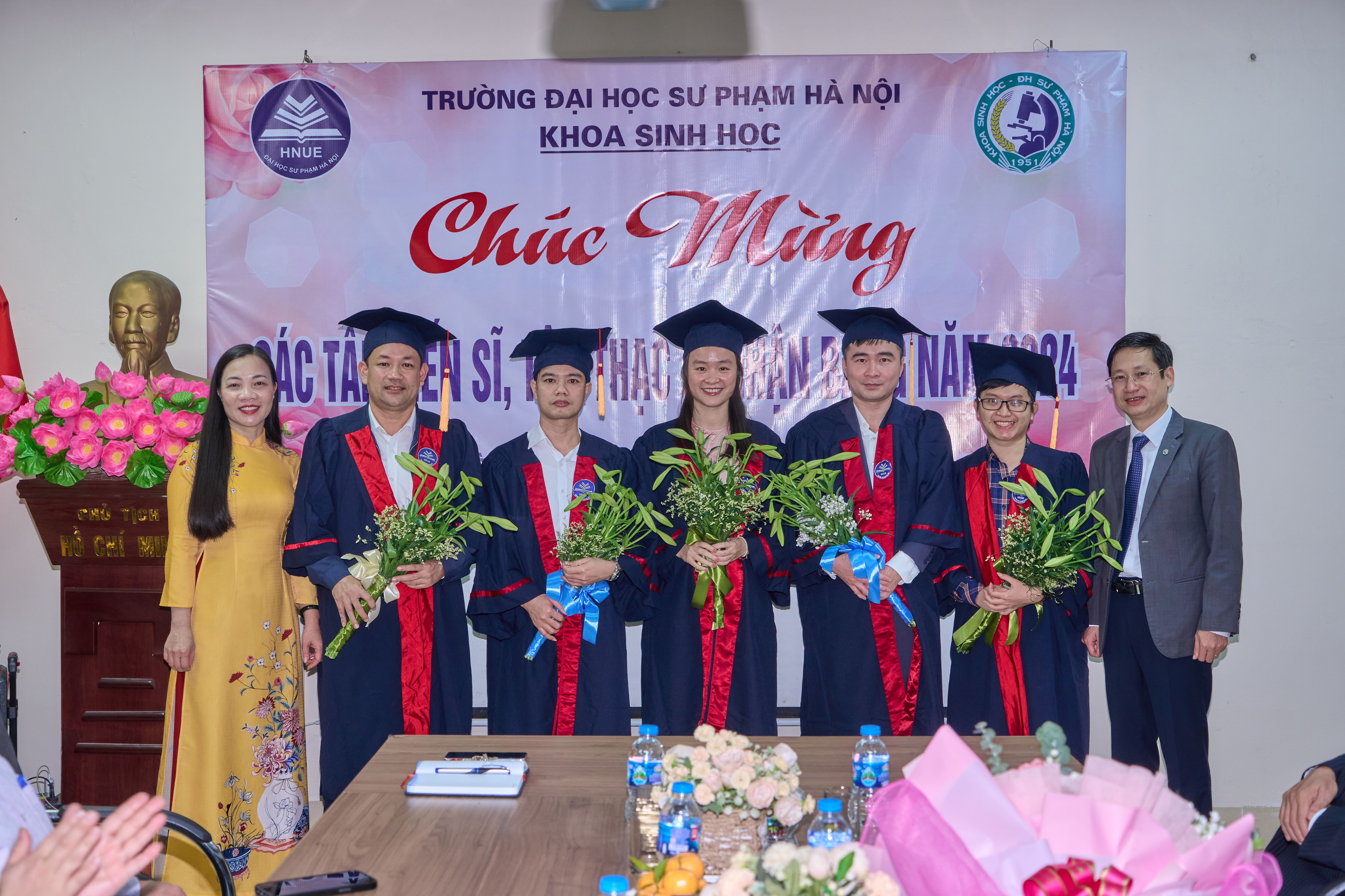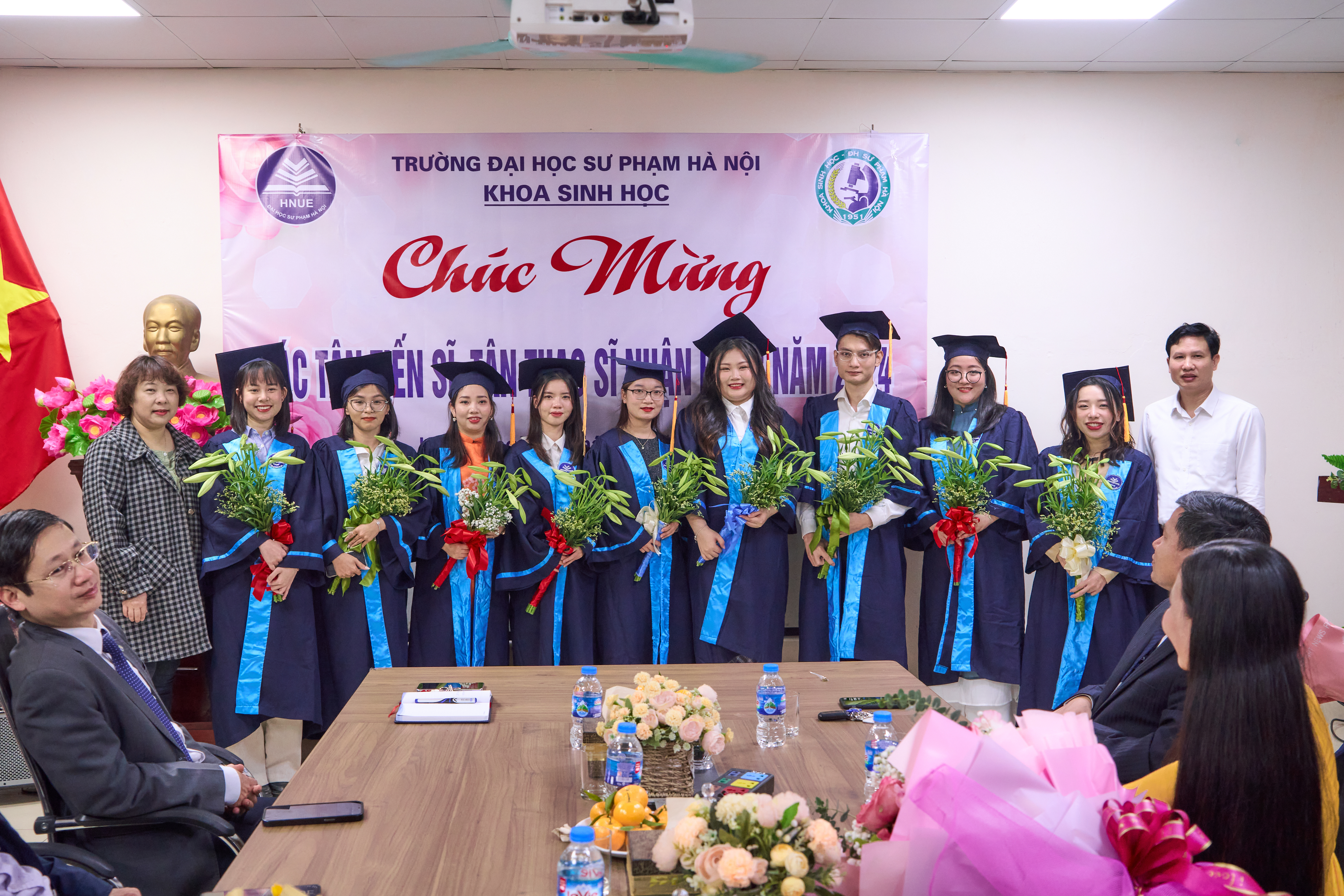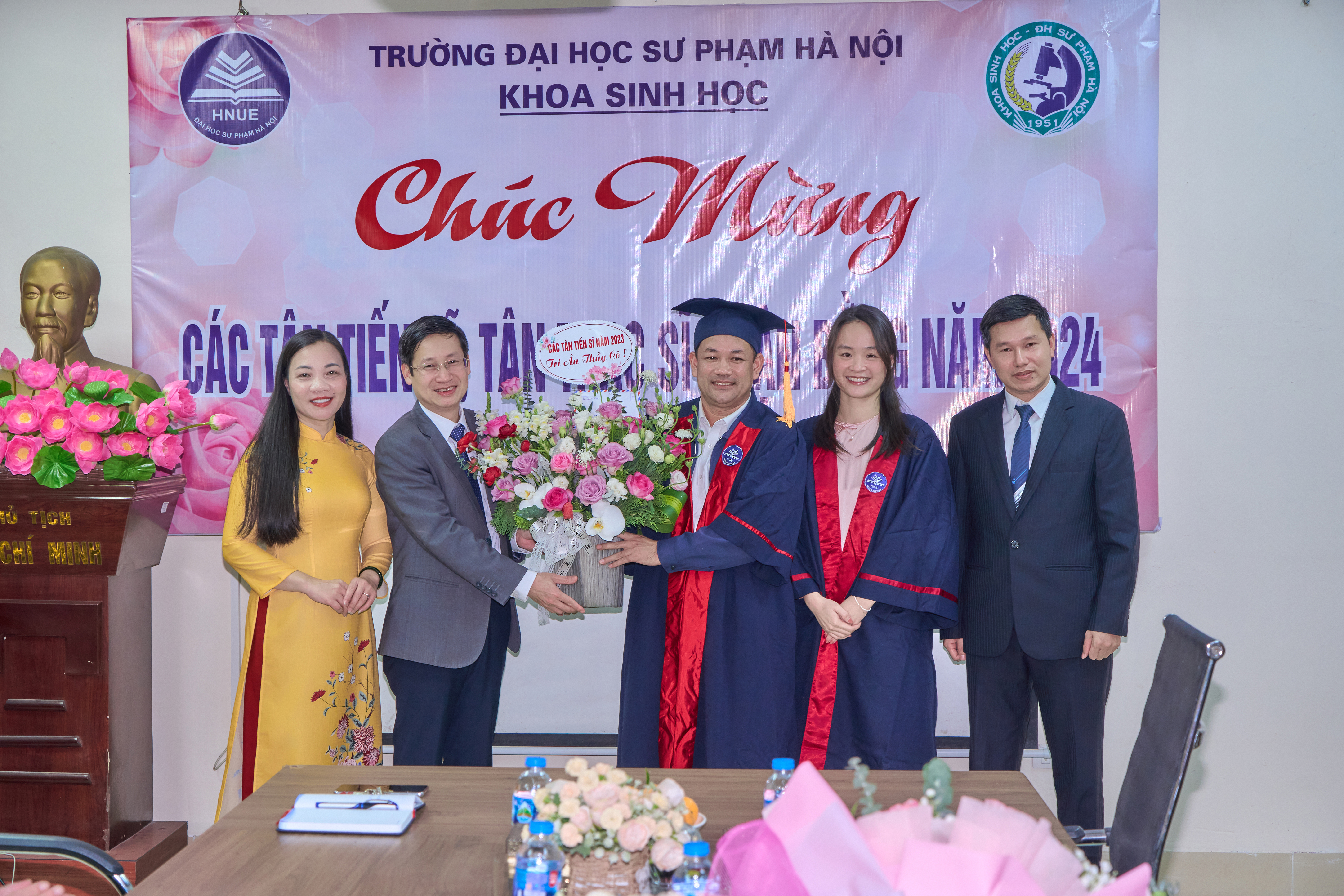 Ảnh 3. Khoa Sinh học gửi tặng những bó hoa tươi thắm chúc mừng đến các tân tiến sĩ, thạc sĩ