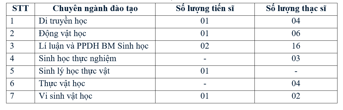 Là một trong những Khoa có bề dày lịch sử với nhiều đóng góp cho hoạt động đào tạo sau đại học của Trường ĐHSP Hà Nội, năm 2024, Khoa Sinh học có 06 tiến sĩ thuộc 4 chuyên ngành và 35 thạc sĩ thuộc cả 6 chuyên ngành đào tạo của Khoa vinh dự được nhận bằng.