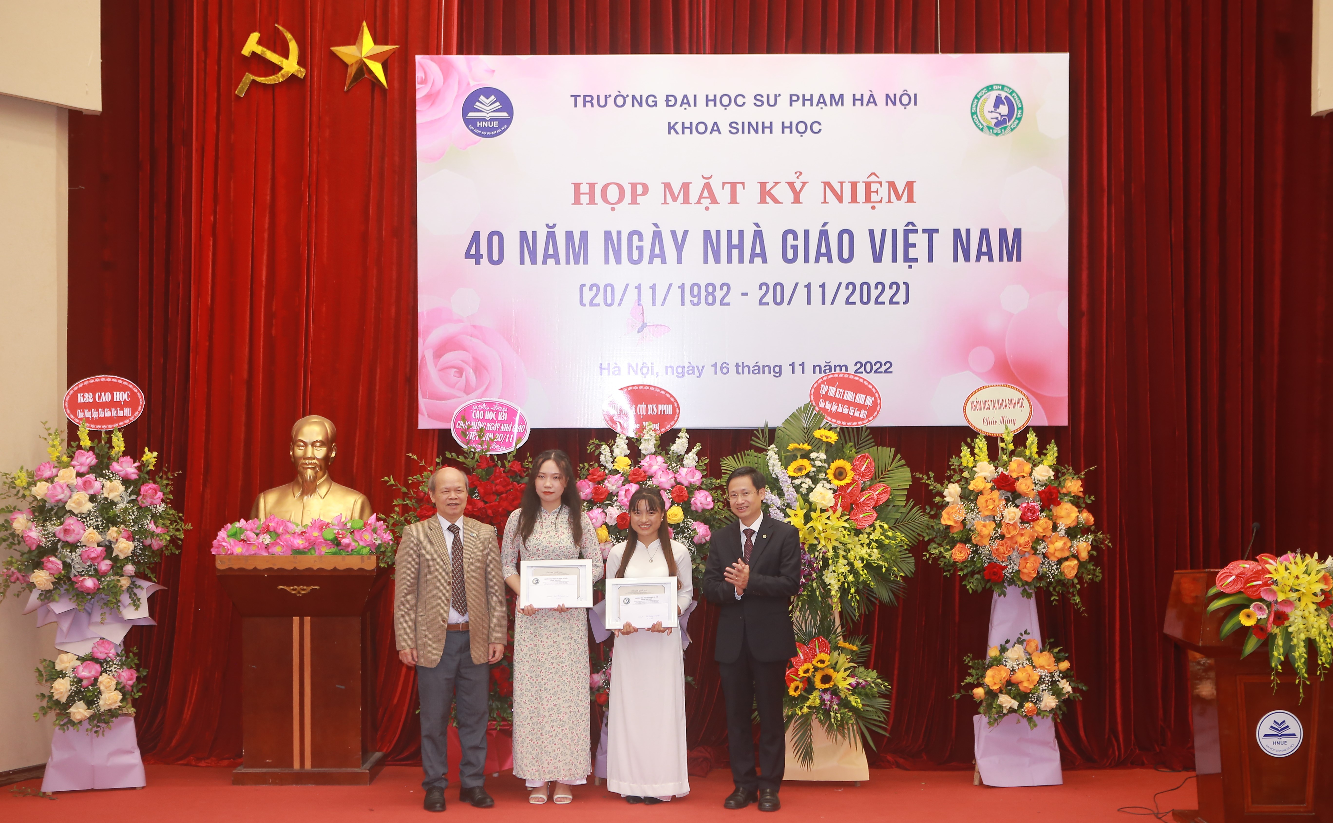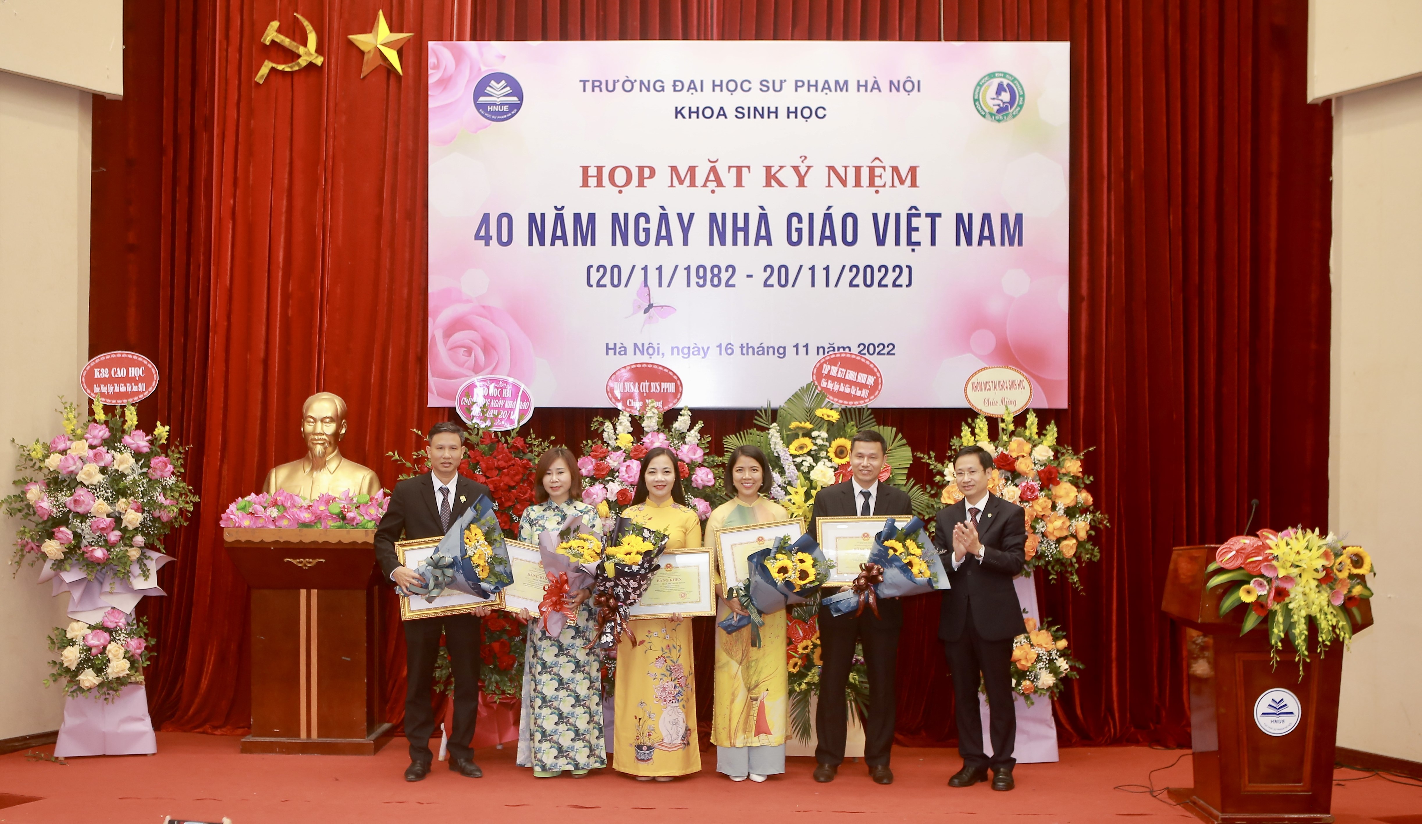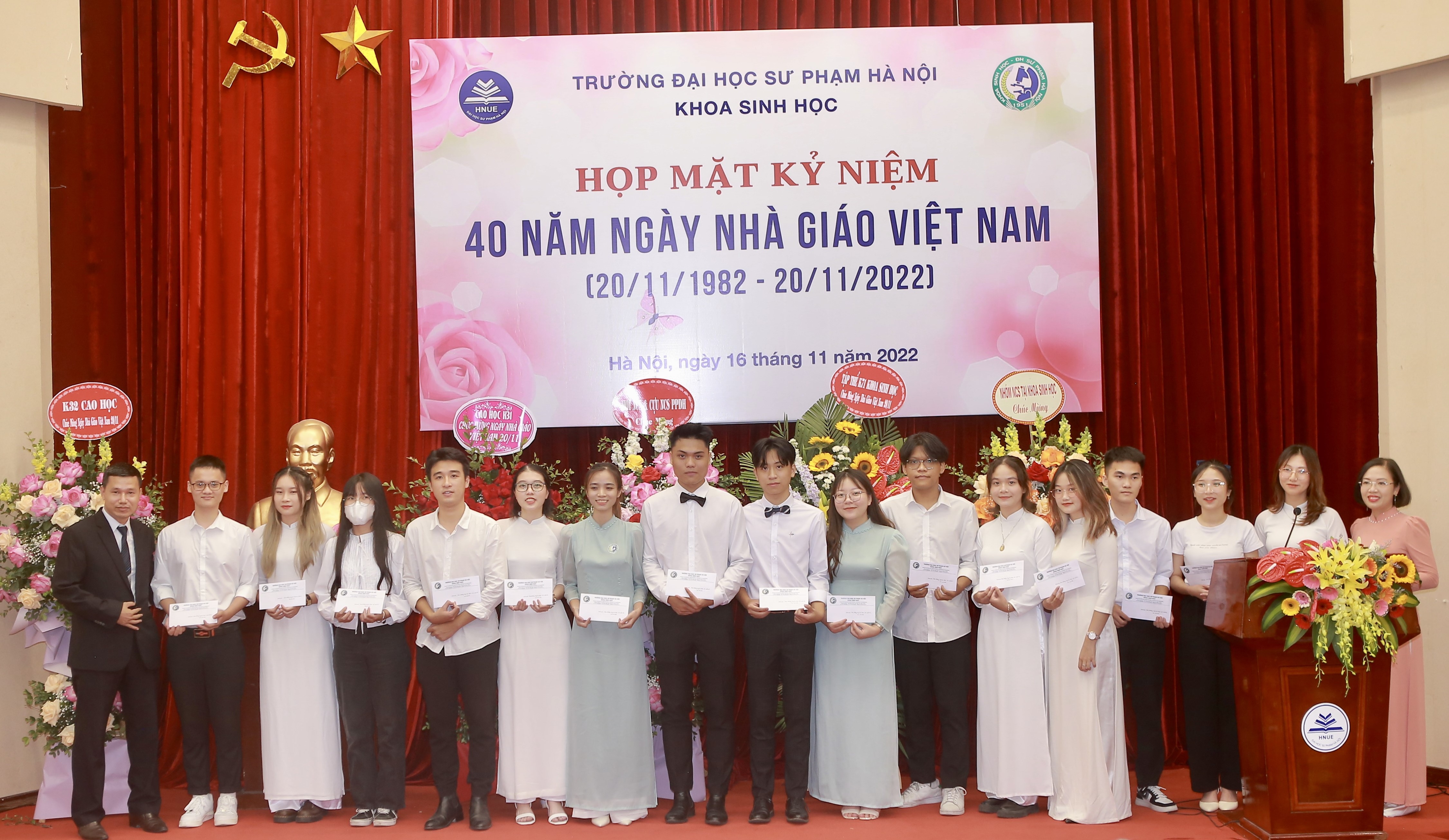 Sau phát biểu của Trưởng khoa Sinh học là các hoạt động vinh danh nhà giáo tiêu biểu như: Trao tặng Bằng khen của Bộ trưởng Bộ GD&ĐT cho các thầy cô giáo có thành tích xuất sắc bao gồm PGS.TS. Trần Thị Thanh Huyền, PGS.TS. Trần Đức Hậu, PGS.TS. Phan Thị Thanh Hội và TS.Trần Khánh Vân. Khoa cũng trân trọng chúc mừng 2 Tân phó giáo sư Nguyễn Phúc Hưng và Trần Thị Thúy vừa được nhà trường công nhận và bổ nhiệm năm 2021. Tiếp theo là phần trao học bổng cho sinh viên các khóa đã có thành tích xuất sắc trong học tập và hoạt động phong trào như: Giải thưởng Sinh quyển năm 2022 - được đề xuất và xây dựng bởi GS.TS. Nguyễn Hoàng Trí, Chủ tịch Ủy ban quốc gia Con người và Sinh quyển Việt Nam - cho 2 sinh viên; Giải thưởng sinh viên đạt thành tích học tập xuất sắc nhất của các lớp trong năm học 2021-2022 cho 12 sinh viên, giải thưởng do GS.TSKH.NGND Phan Nguyên Hồng - nhà khoa học Việt Nam đầu tiên đạt Giải thưởng COSMOS quốc tế - đề xuất; Giải thưởng cho 32 sinh viên có thành tích xuất sắc trong các hoạt động phong trào.