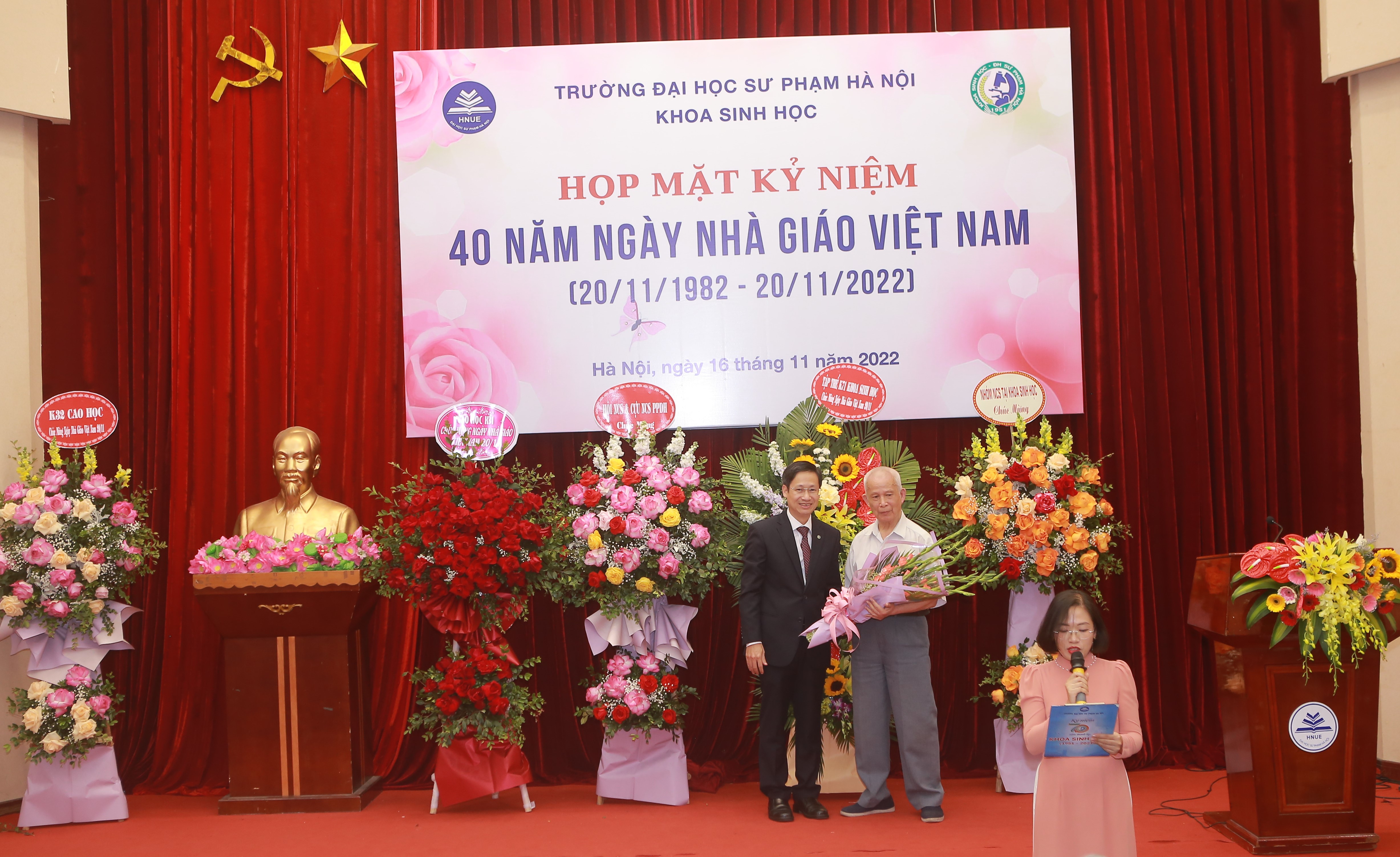 Để thể hiện lòng tri ân đối với các thế hệ thầy, cô giáo, đã dành cả cuộc đời vì sự phát triển của khoa Sinh học, PGS.TS. Nguyễn Lân Hùng Sơn trao tặng hoa và chúc mừng các thế hệ cán bộ, giảng viên đã từng công tác tại khoa, GS.TSKH. NGND Thái Trần Bái thay mặt lên bục danh dự nhận bó hoa tươi thắm.