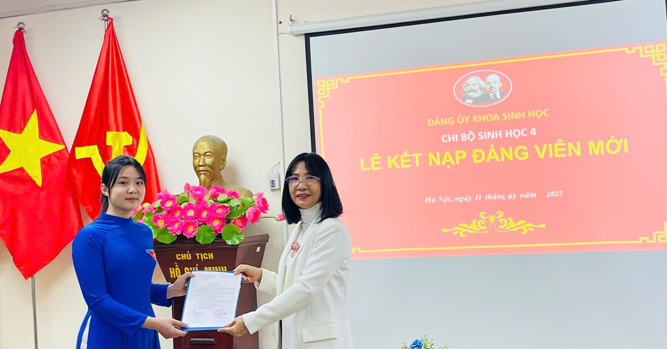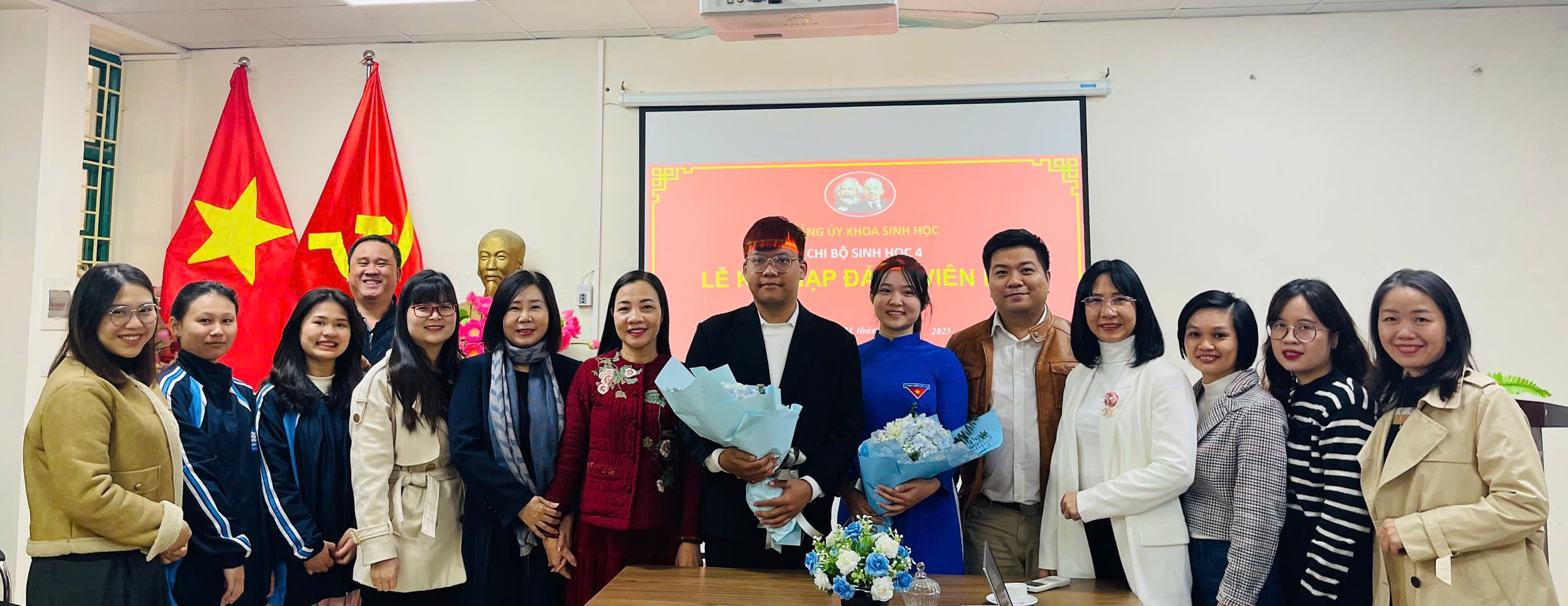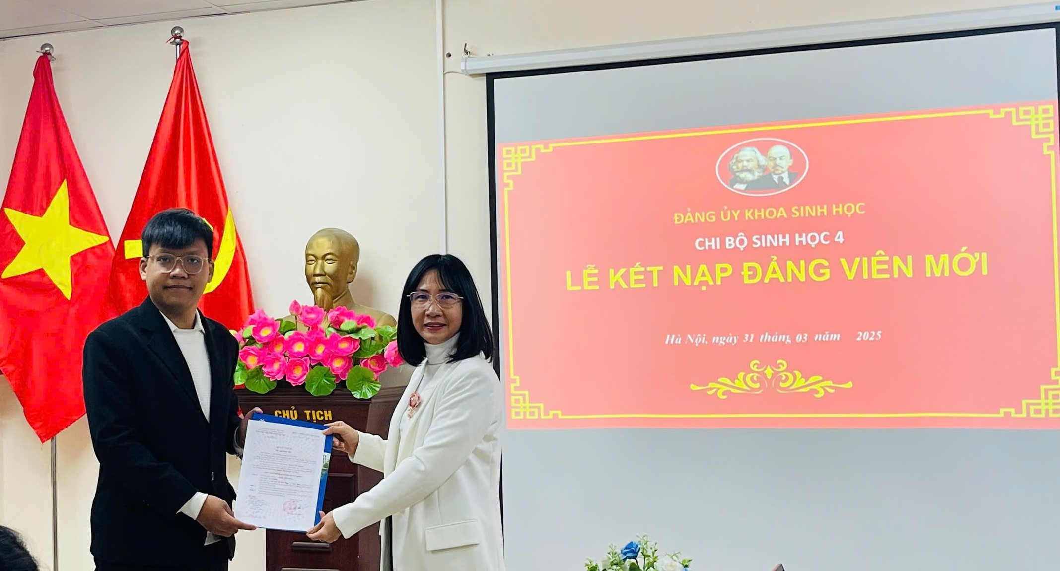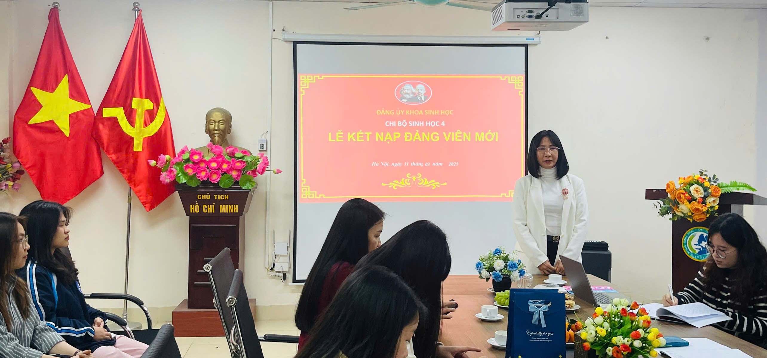 Mở đầu buổi lễ kết nạp, thay mặt Chi bộ Sinh học 4, đồng chí Lê Thị Phương Hoa - Bí thư chi bộ đã đọc và trao Quyết định kết nạp Đảng viên cho đồng chí Nguyễn Thế Dương và Đỗ Khánh Linh. Trong không khí trang nghiêm, trước cờ Tổ quốc, cờ Đảng và chân dung Chủ tịch Hồ Chí Minh, Đảng viên Nguyễn Thế Dương và Đỗ Khánh Linh đã đọc lời tuyên thệ, nguyện trung thành với lý tưởng và mục tiêu Cách mạng của Đảng, thực hiện nghiêm túc các nhiệm vụ của Đảng viên, đóng góp tích cực vào việc xây dựng Đảng, xứng đáng là Đảng viên của Đảng cộng sản Việt Nam.