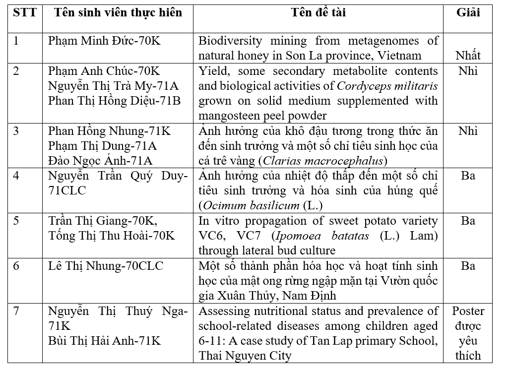 Bảng: Danh sách các báo cáo poster được trao giải tại Hội nghị Sinh viên NCKH