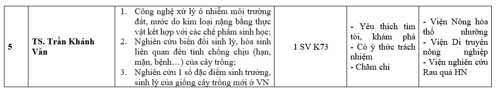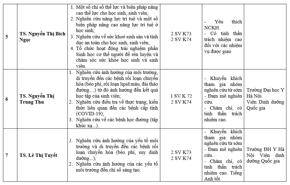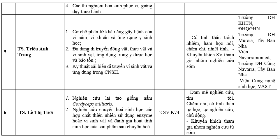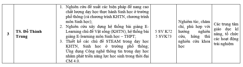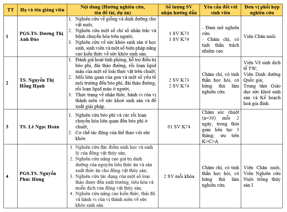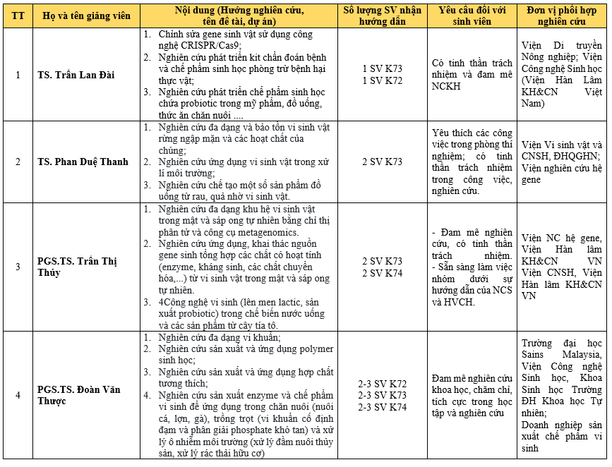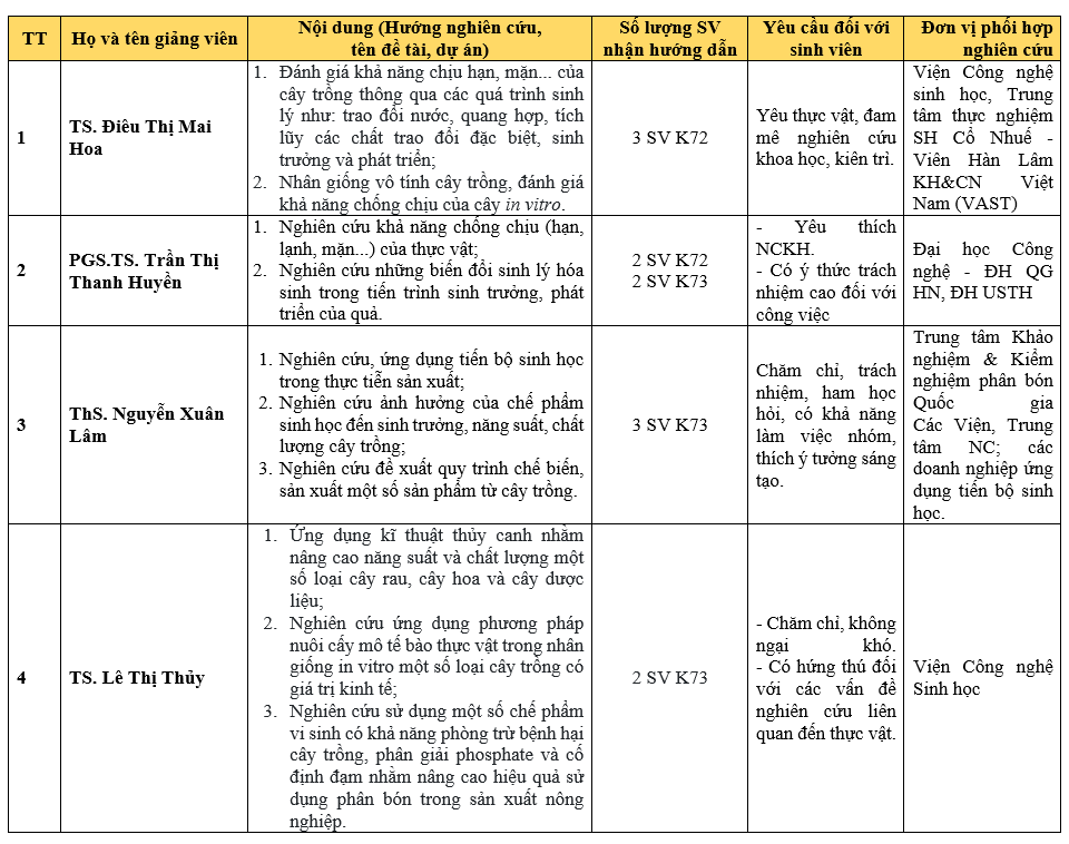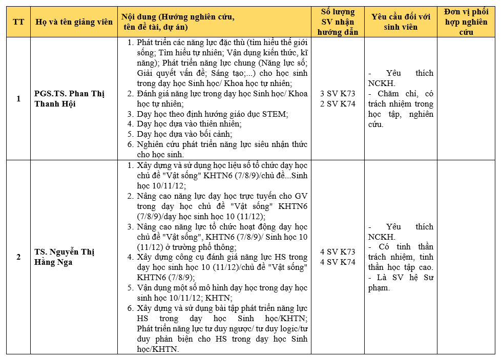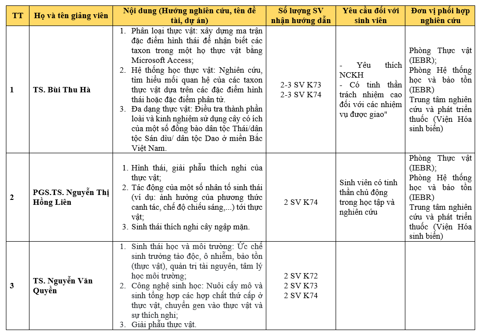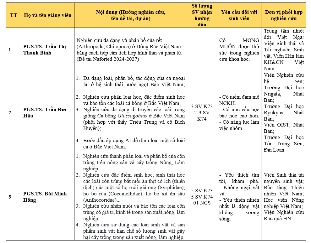Nghiên cứu khoa học là cơ hội để sinh viên rèn luyện sự kiên trì, phát huy sức sáng tạo của bản thân, cũng như trang bị cho mình những kiến thức, kĩ năng phục vụ cho nghề nghiệp trong tương lai. Nhằm hỗ trợ và định hướng cho hoạt động nghiên cứu khoa học của sinh viên, Khoa Sinh học trân trọng giới thiệu đến đến các bạn một số đề tài, hướng nghiên cứu chính của các thầy cô trong năm học 2024 – 2025.