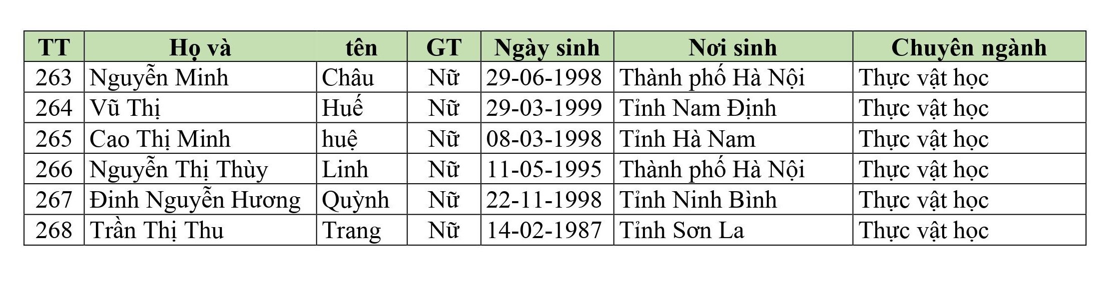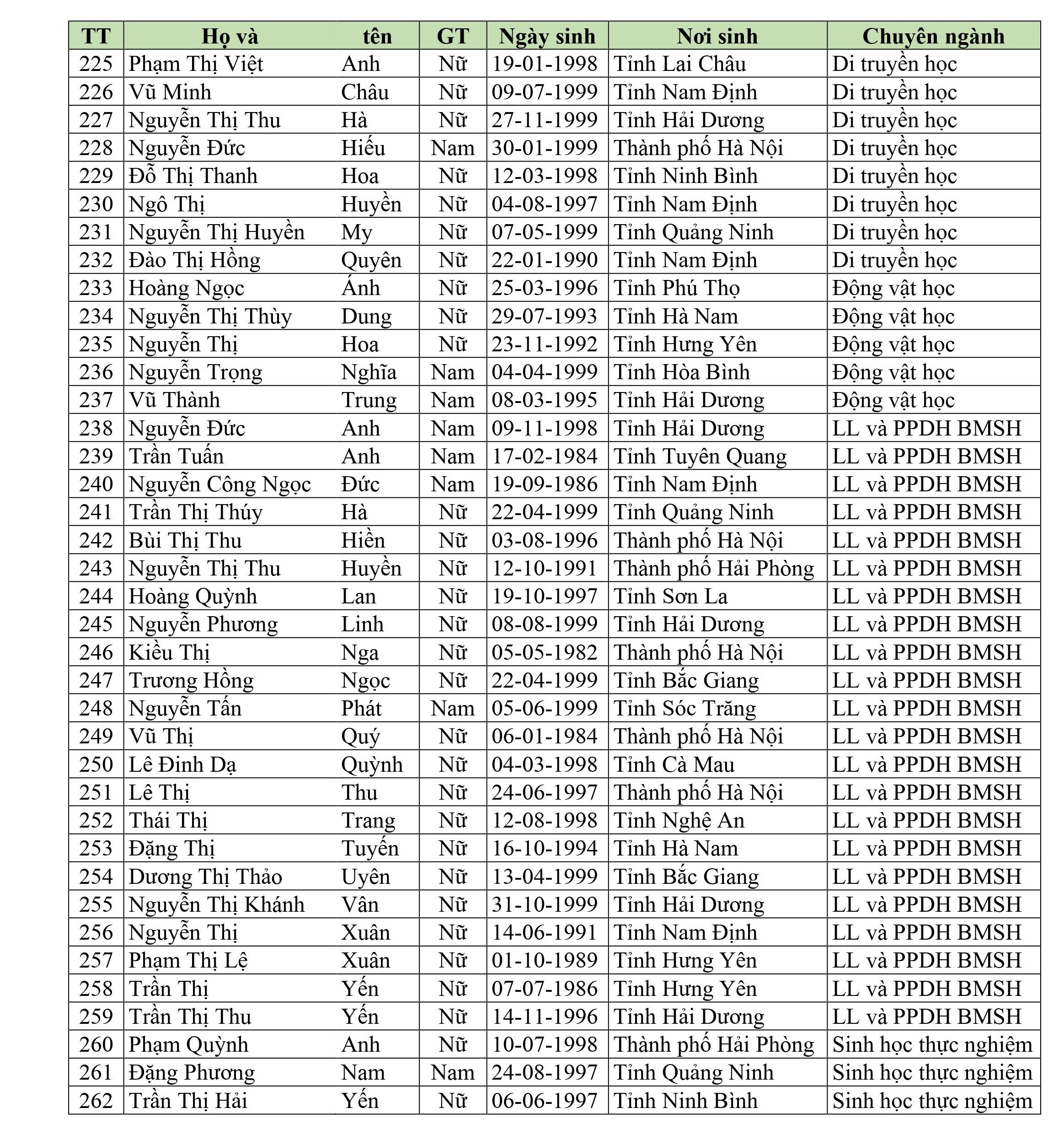 Danh sách học viên thạc sĩ Khóa 31 Khoa Sinh học